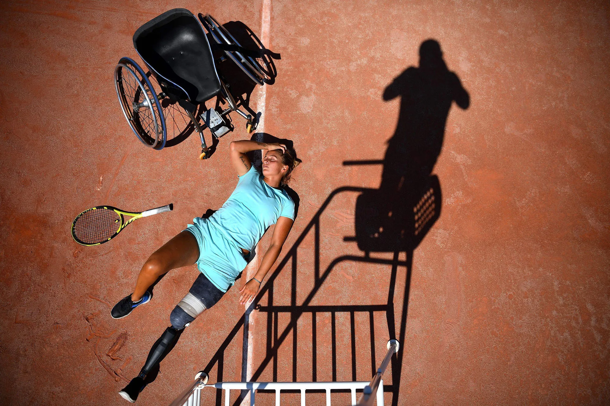 French tennis para athlete Pauline Deroulede, stretches prior her training session on May 26, 2020 in Feucherolles near Paris, as France eases lockdown measures taken to curb the spread of the COVID-19 disease caused by the novel coronavirus. (Photo by Franck Fife/AFP Photo)