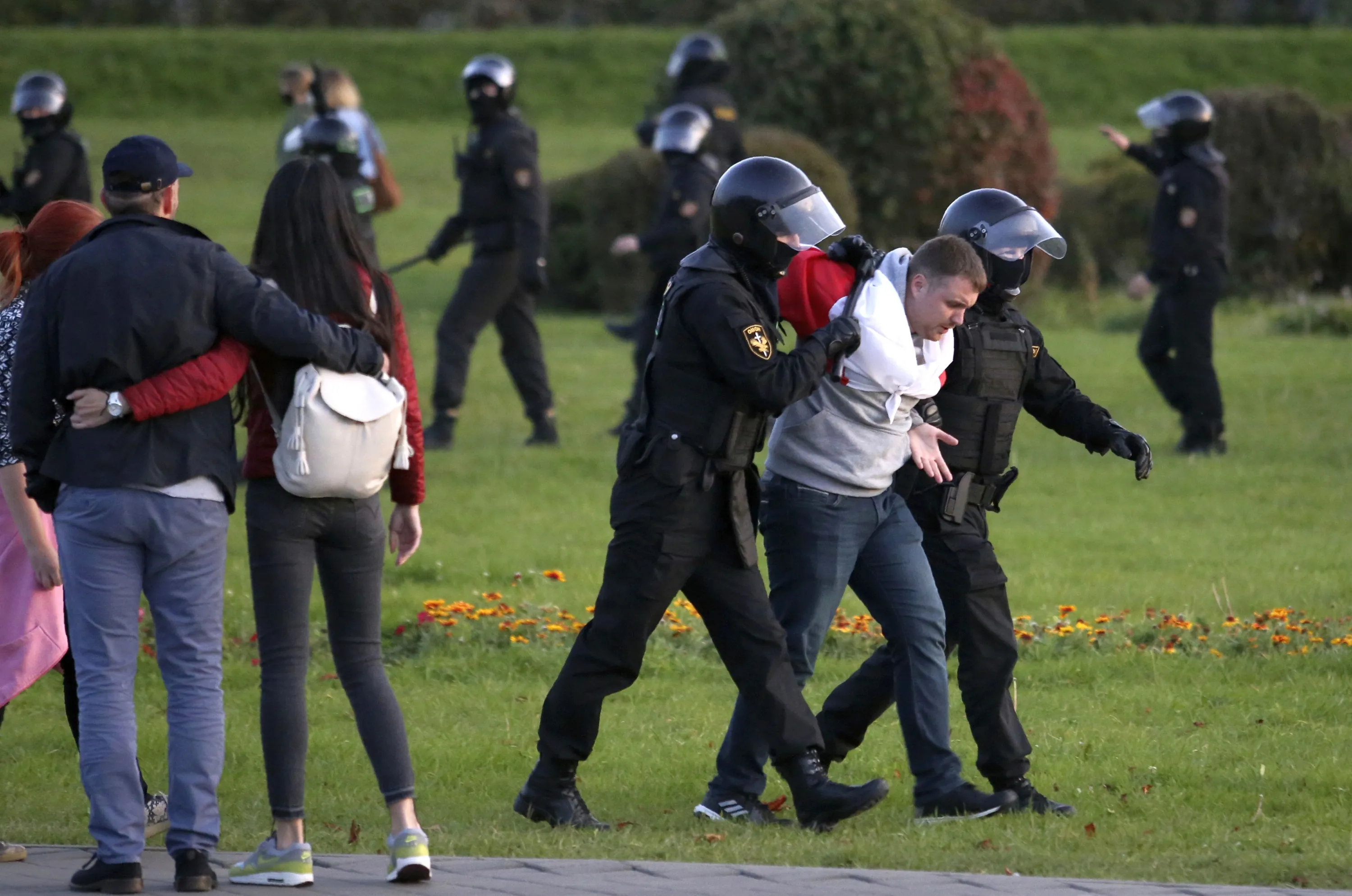 Riot police detain a protester during an opposition rally to protest the presidential inauguration in Minsk, Belarus, Wednesday, September 23, 2020. (Photo by TUT.by via AP Photo)