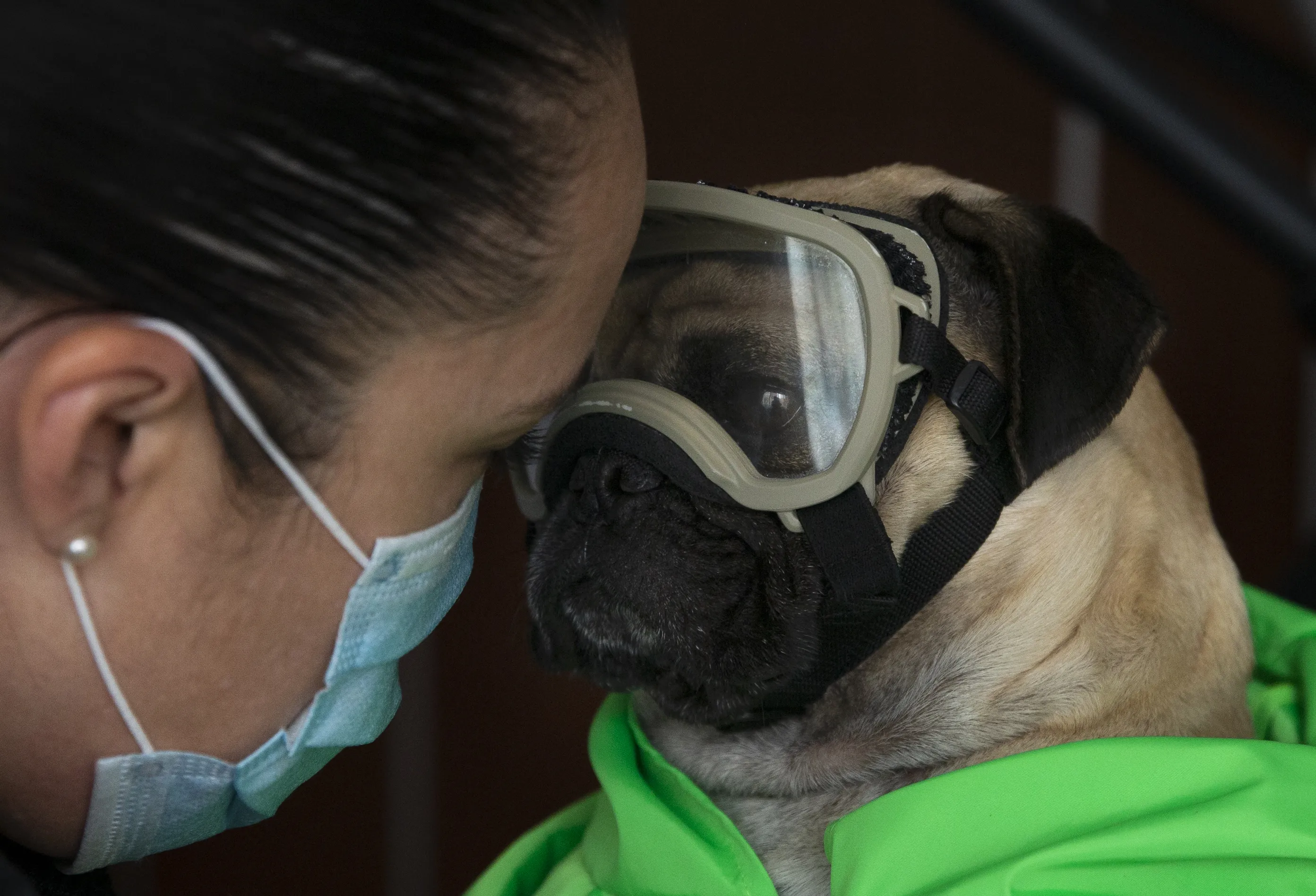 Clinical neuropsychologist Dr. Lucia Ledesma eyes her pet Harley, a therapy dog who provides emotional support for healthcare workers who are treating patients infected with the new coronavirus, rests on his bed in Mexico City, Saturday, September 12, 2020. (Photo by Marco Ugarte/AP Photo)