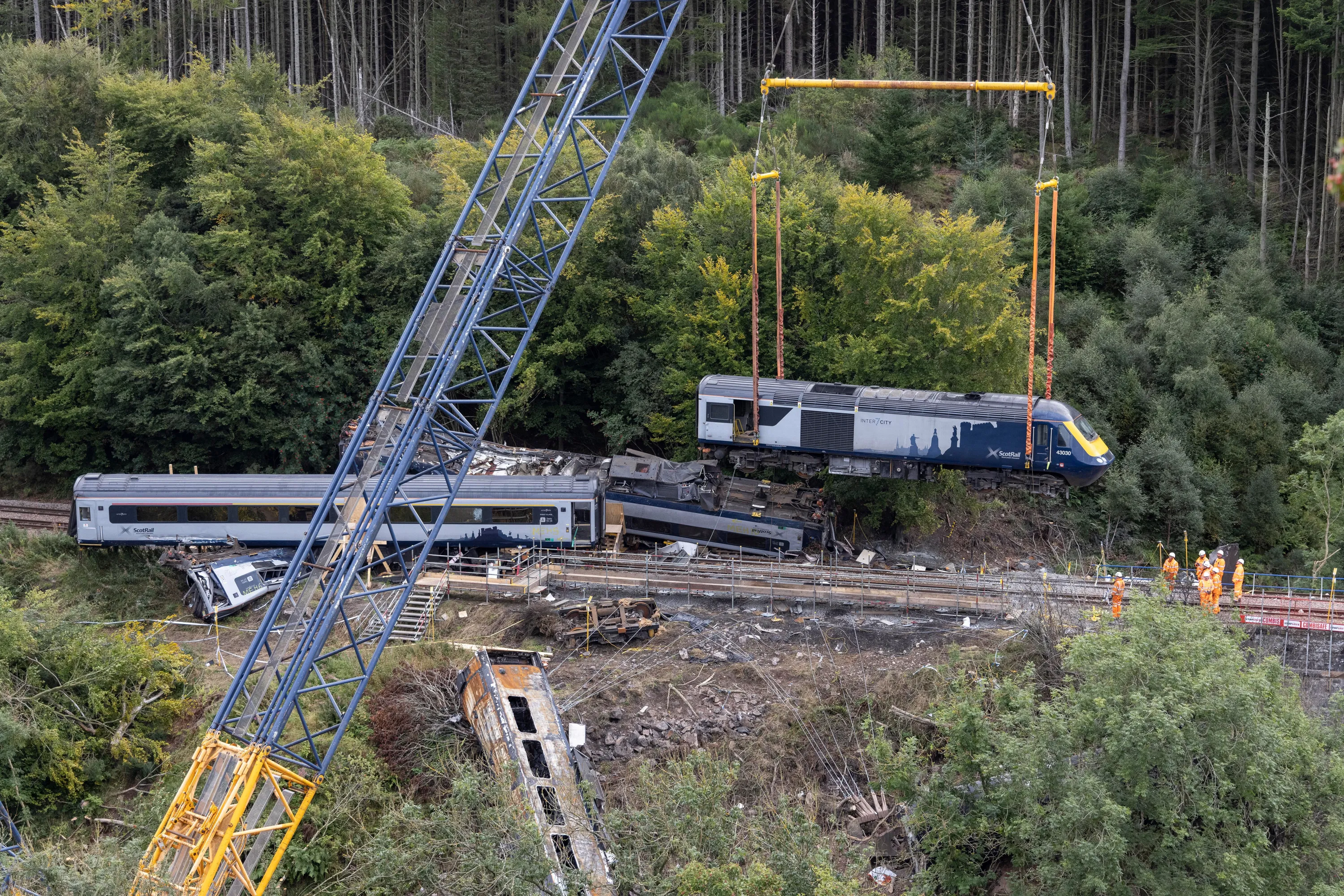 The carriage is lifted by a giant 600 tonne crane from the scene at the train derailment on September 10, 2020 in Stonehaven, Scotland. The train derailed on August 12 after hitting a landslide on the tracks, killing two crew members and a passenger. (Photo by Derek Ironside – Pool/Getty Images)
