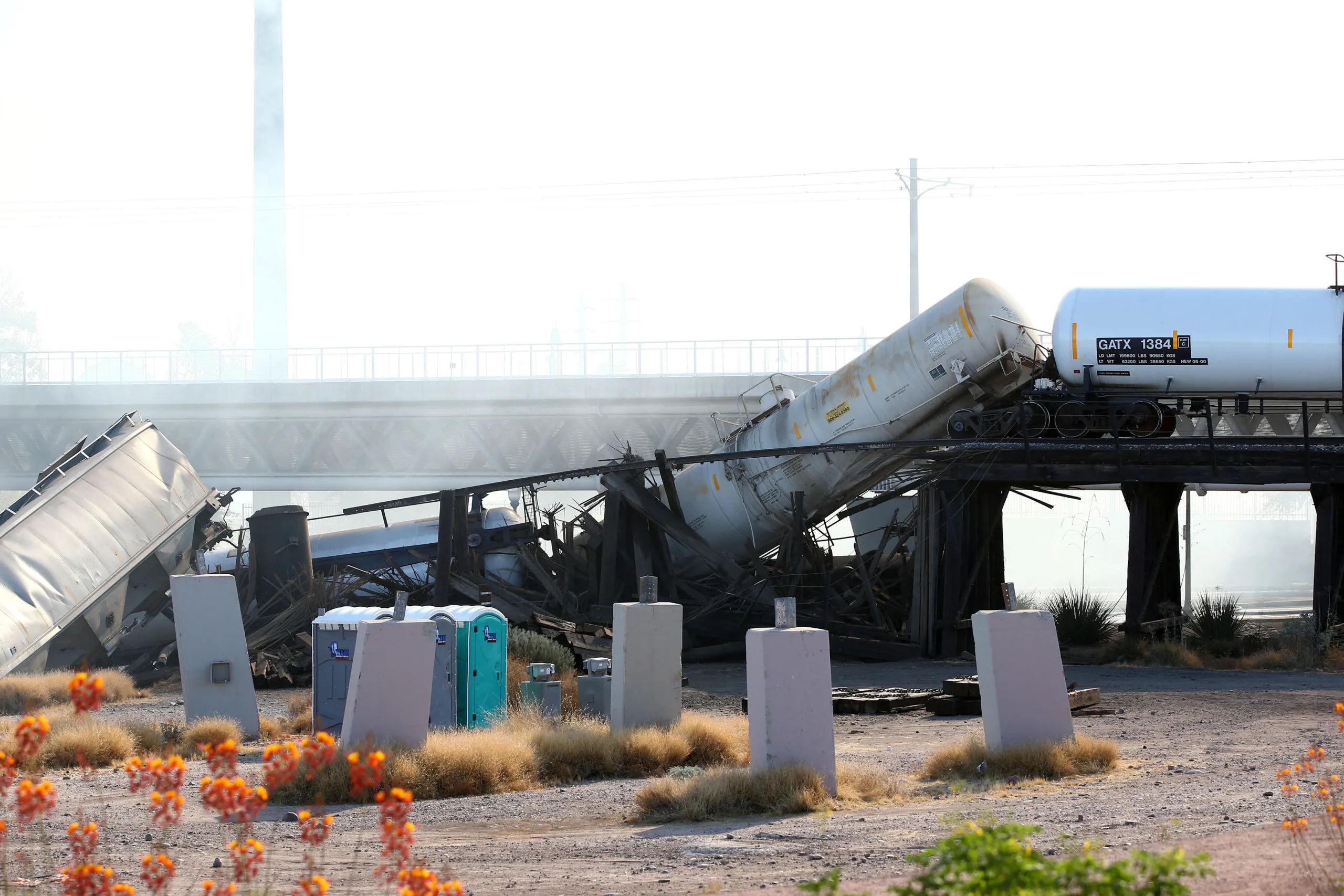 A derailed train burns over a portion of the bridge over Tempe Beach Park in Tempe, Arizona, U.S. July 29, 2020. (Photo by Rob Schumacher/The Arizona Republic via USA TODAY Network)