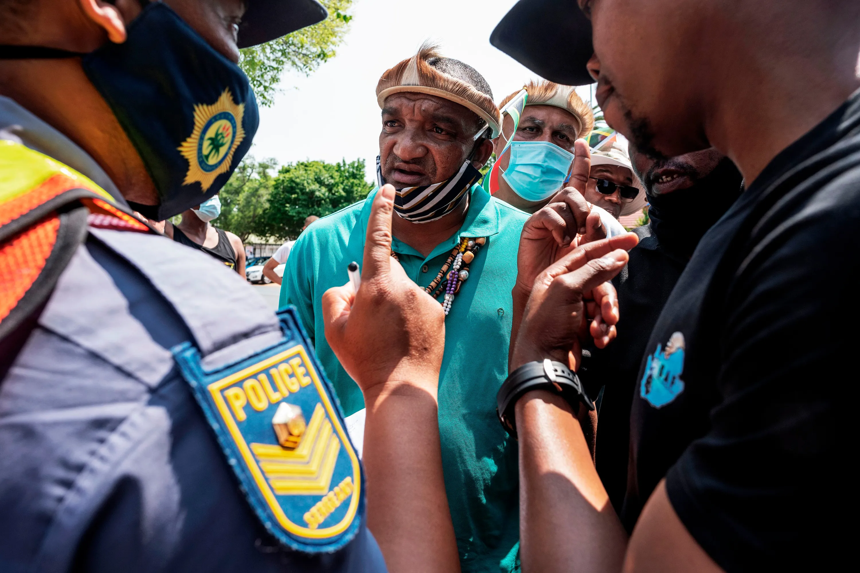 A South African Police Service (SAPS) officer argues with a protester during a march under the banner of “#Put South Africans First” outside the Nigerian Embassy in Pretoria on September 23, 2020. (Photo by Luca Sola/AFP Photo)