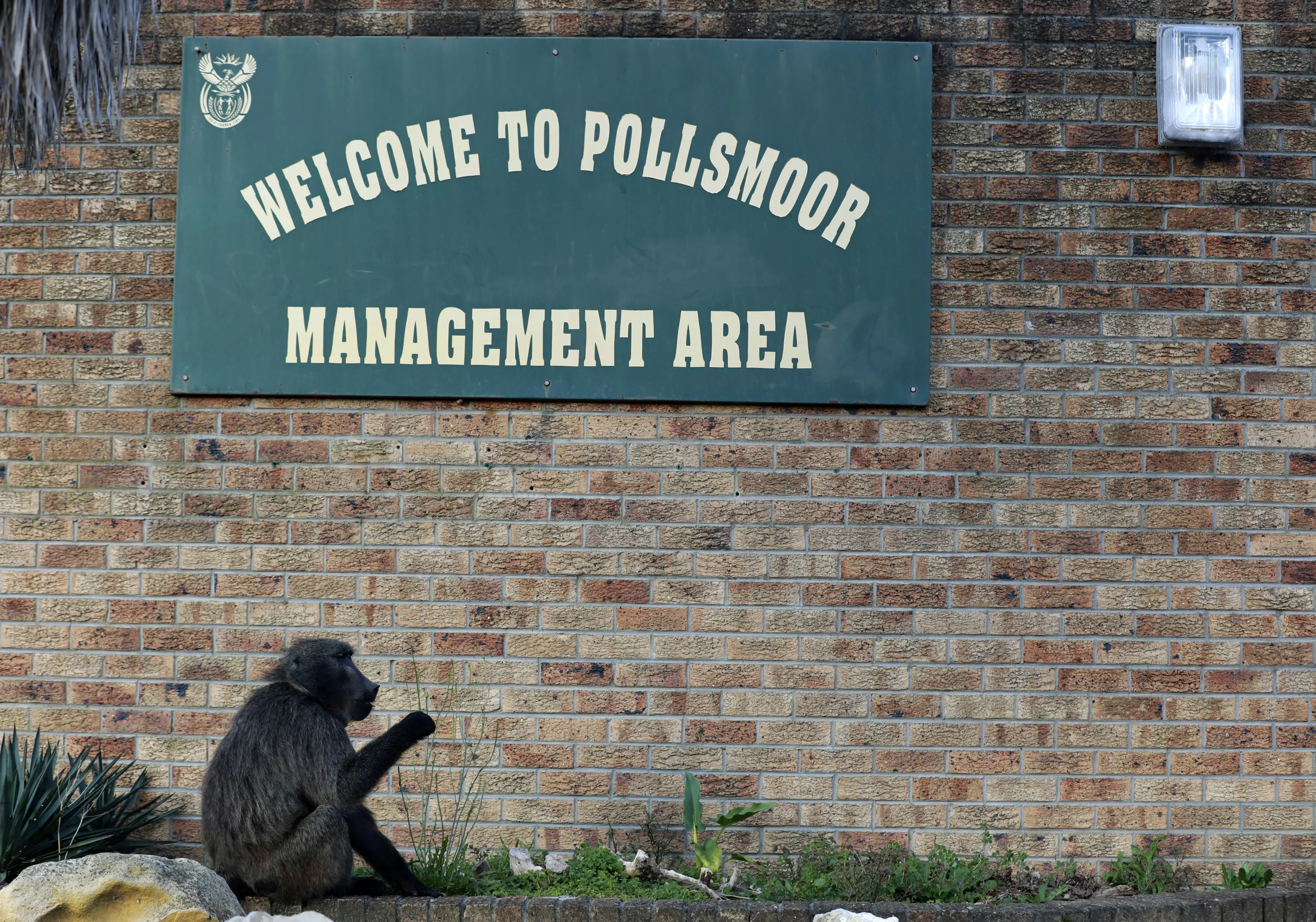A baboon, named Kataza by locals, sits outside the Pollsmoor Maximum Security Prison in Tokai, Cape Town, South Africa, Thursday, September 17, 2020. Kataza was relocated from Kommetjie, on the edges of Cape Town, to a nearby area late last month after city authorities claimed he was responsible for leading other baboons in his troop on raids through the village. One activist says Kataza is now wandering alone in an unfamiliar area and sleeping in a prison yard. (Photo by Nardus Engelbrecht/AP Photo)
