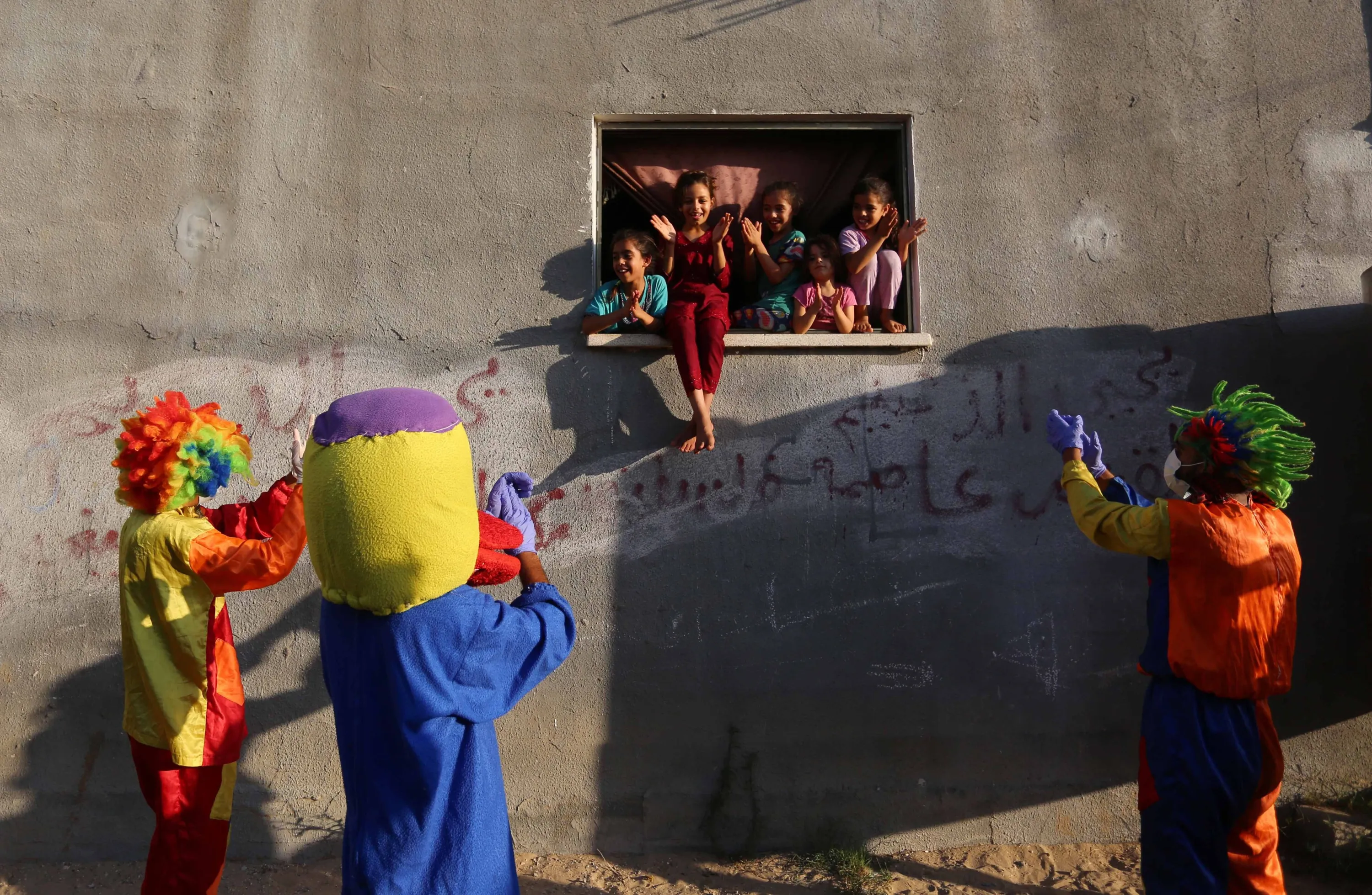 Palestinian youth, wearing clown costumes, entertain children on September 02, 2020 in Gaza City, Gaza during the lockdown imposed as a measure against the coronavirus (COVID-19) pandemic. (Photo by Ashraf Amra/Anadolu Agency via Getty Images)