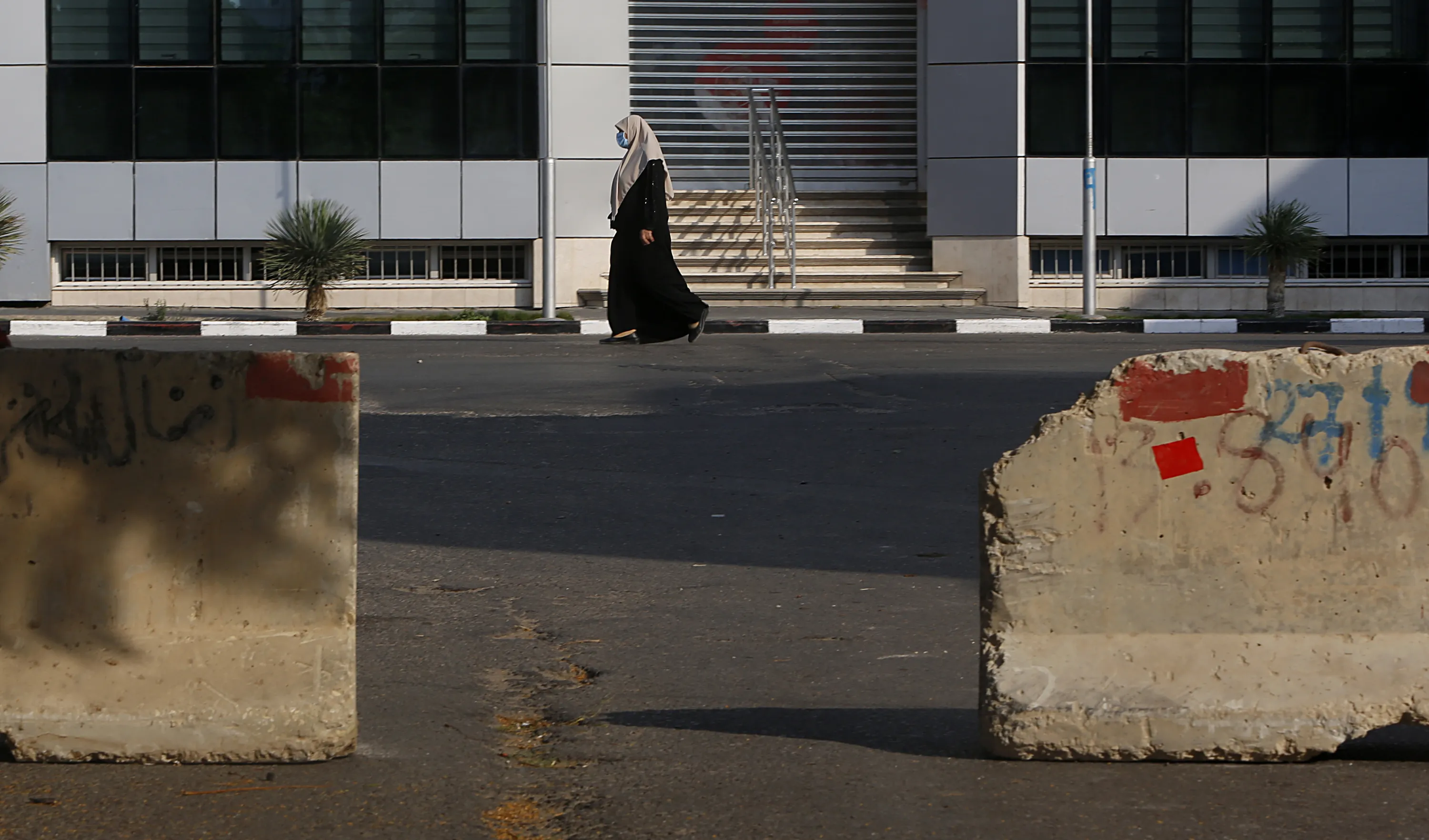 A Palestinian woman walks on a road next to barriers during a lockdown imposed following the discovery of a rise in coronavirus cases in Gaza City, Monday, August 31, 2020. (Photo by Hatem Moussa/AP Photo)