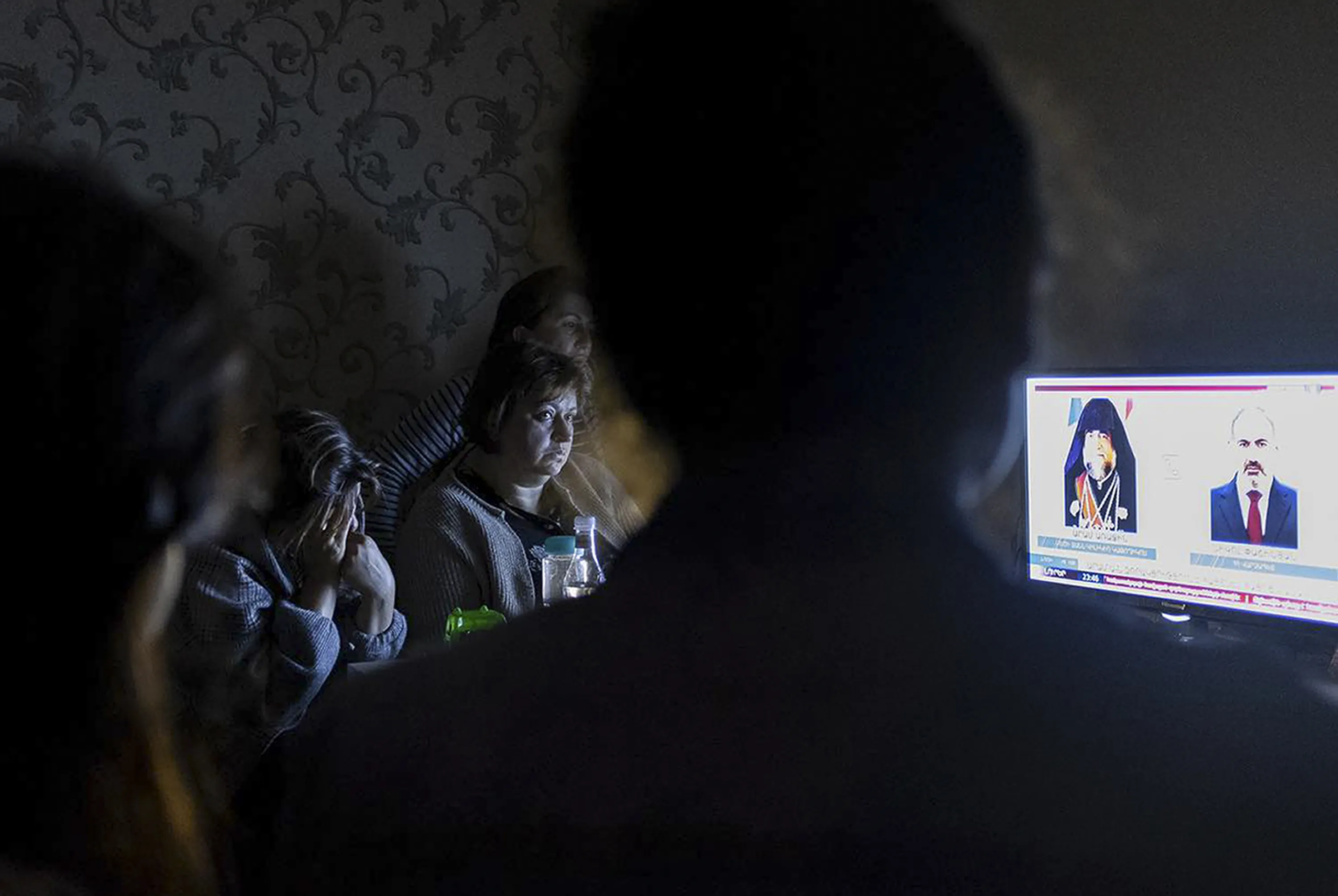 In this handout photo released by the Armenian Foreign Ministry on Monday, September 28, 2020, people watch the State TV as they gather in a bomb shelter for protection against the shelling in Stepanakert, the self-proclaimed Republic of Nagorno-Karabakh, Azerbaijan. Nagorno-Karabakh authorities reported that shelling hit the region's capital of Stepanakert and the towns of Martakert and Martuni. Armenian Defense Ministry spokesman Artsrun Hovhannisyan also said Azerbaijani shelling hit within Armenian territory near the town of Vardenis. (Photo by Armenian Foreign Ministry via AP Photo)