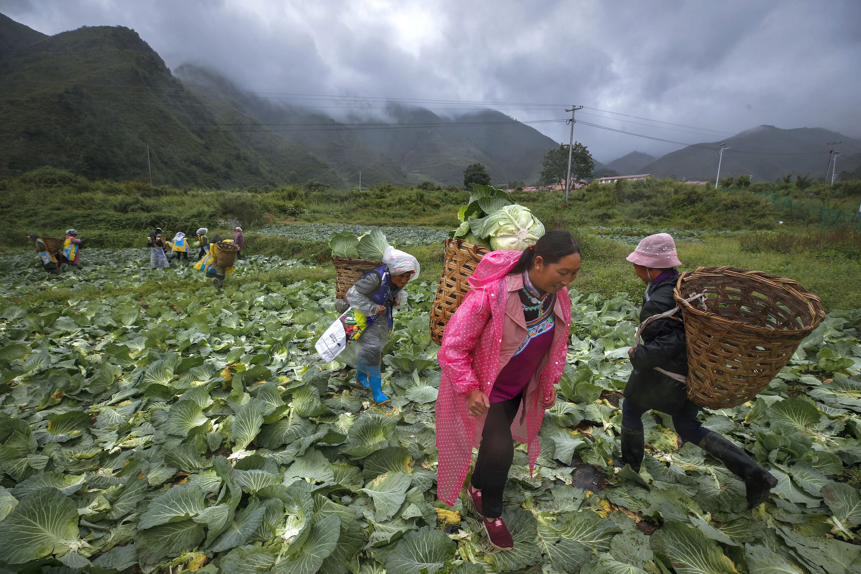Minority women collect cabbages at a farm near their village houses built by the Chinese government for the ethnic minority members in Ganluo county, southwest China's Sichuan province on September 10, 2020. (Photo by Andy Wong/AP Photo)