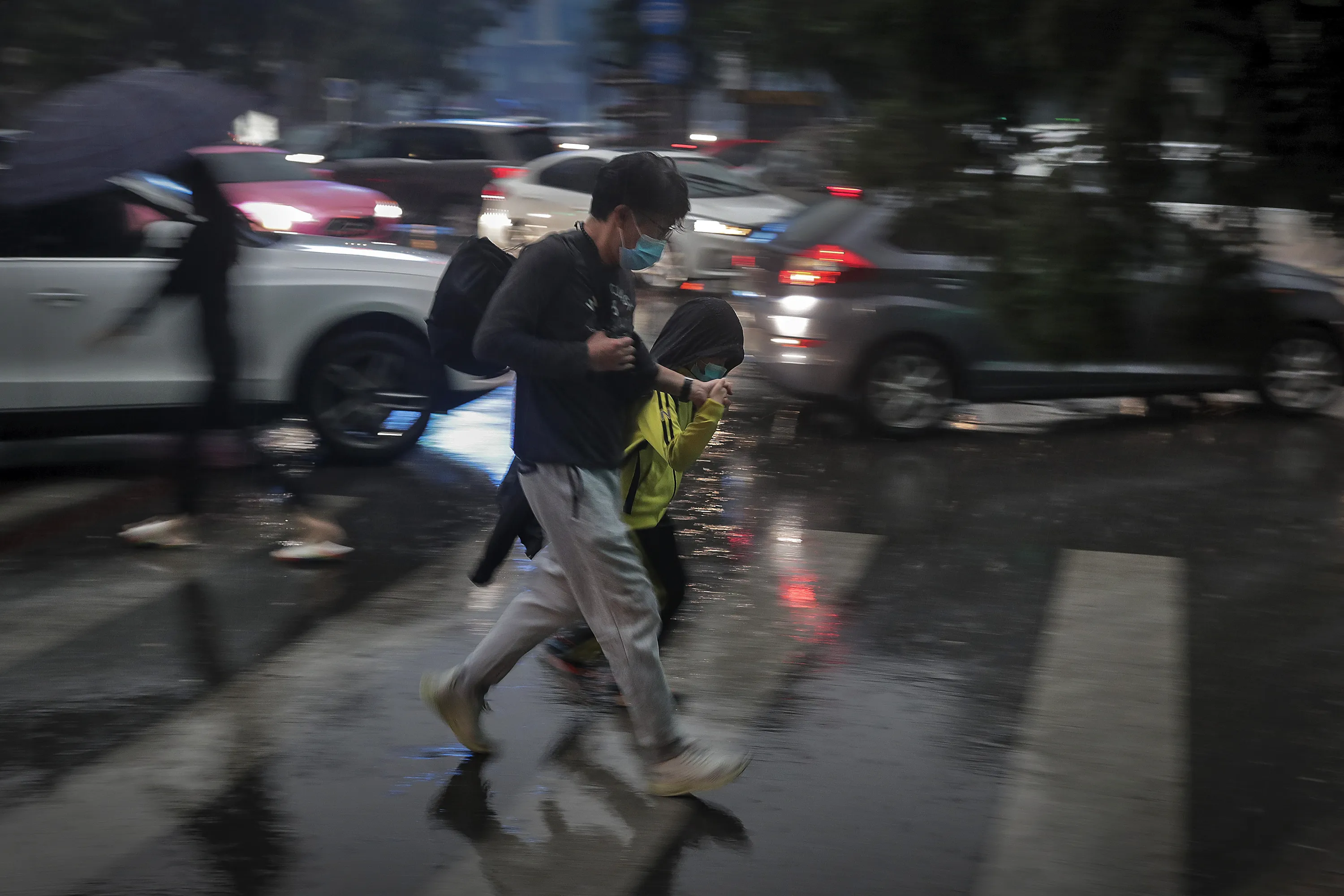 A man and a child wearing face masks to help curb the spread of the coronavirus walk across a street in the rain as motorists are clogged with heavy traffic on a road in Beijing, Wednesday, September 23, 2020. Xi Jinping, China's president and the leader of its Communist Party, cast the fight against the virus as an important exercise in international cooperation, an opportunity to “join hands and be prepared to meet even more global challenges”. (Photo by Andy Wong/AP Photo)
