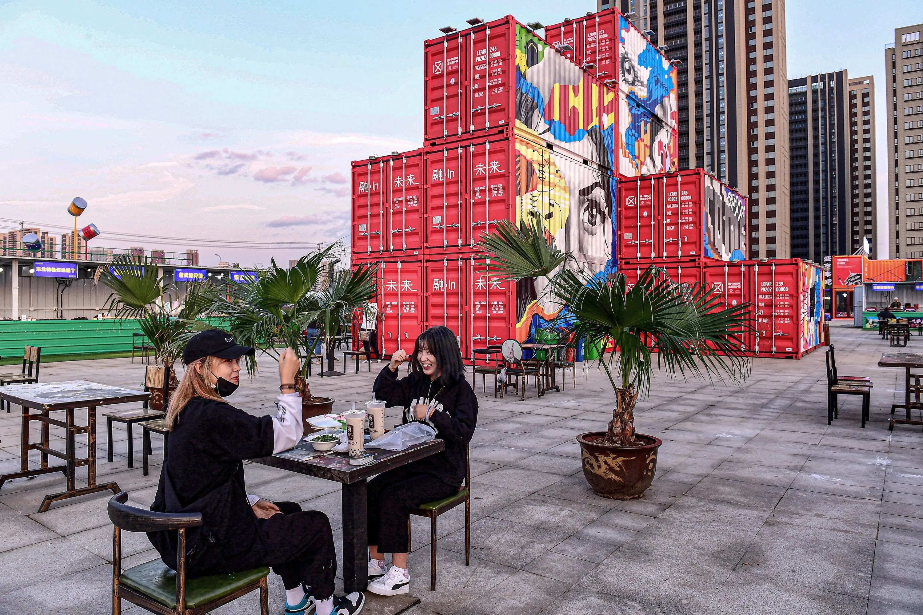 This photo taken on September 20, 2020 shows people visiting a shopping district made out of shipping containers in Shenyang in China's northeastern Liaoning province. (Photo by AFP Photo/China Stringer Network)