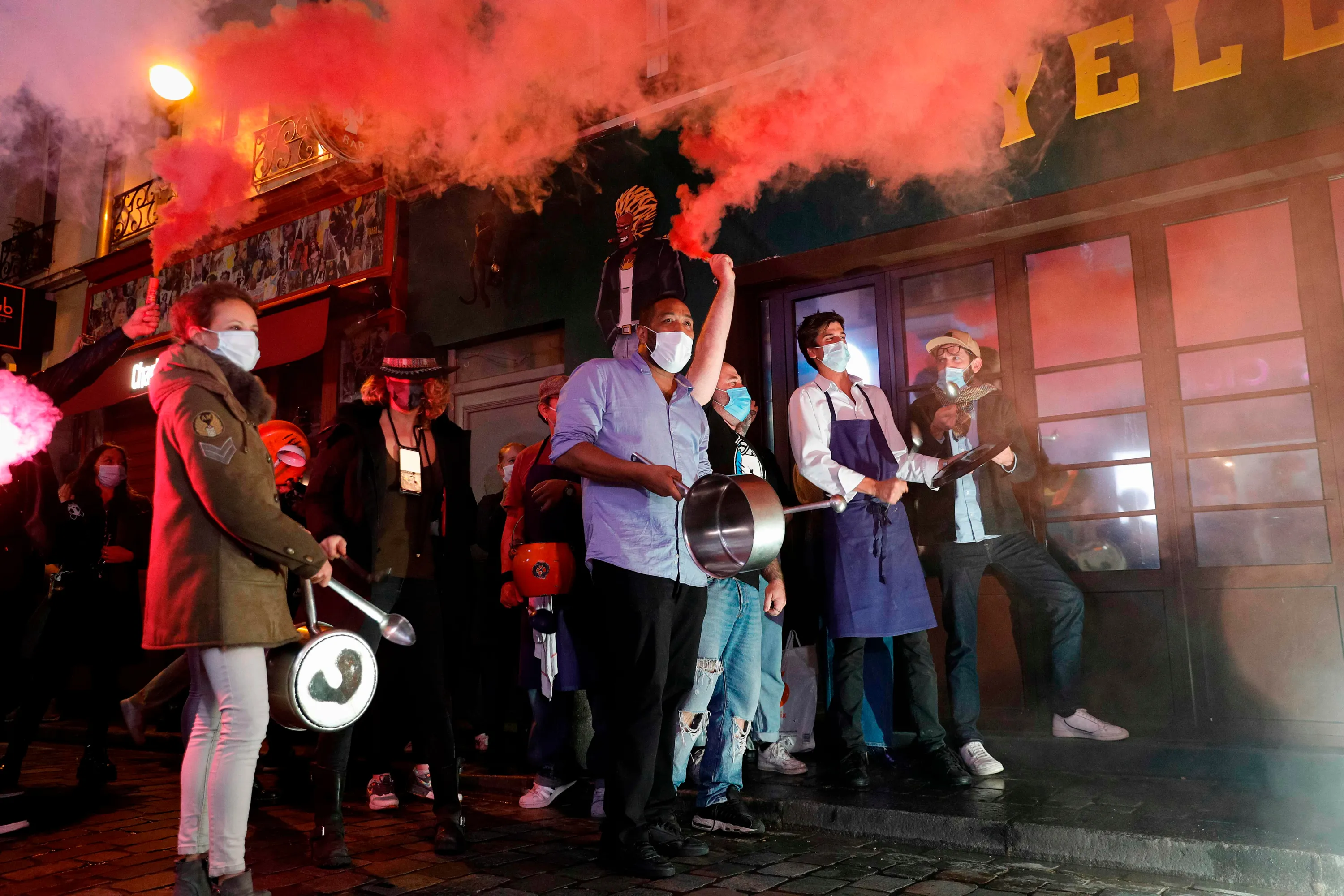 Restaurants and bars owners make noise as they protest in Paris on September 29, 2020, as the city is being forced to close bars and restaurants due to the health situation caused by the spread of the Covid-19 novel coronavirus. French government imposed fresh curbs to limit the spread of the virus, including on restaurants, bars and sports facilities. (Photo by Geoffroy van der Hasselt/AFP Photo)