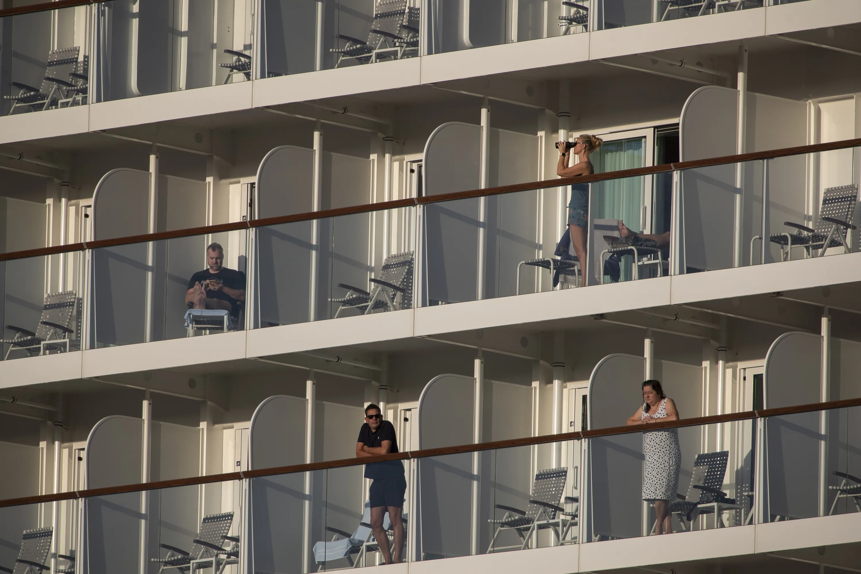Passengers of the Mein Schiff 6 cruise ship stand outside their cabins as the ship is docked at Piraeus port, near Athens on Tuesday, September 29, 2020. Greek authorities say 12 crew members on a Maltese-flagged cruise ship carrying more than 1,500 people on a Greek islands tour have tested positive for coronavirus and have been isolated on board. (Photo by Petros Giannakouris/AP Photo)
