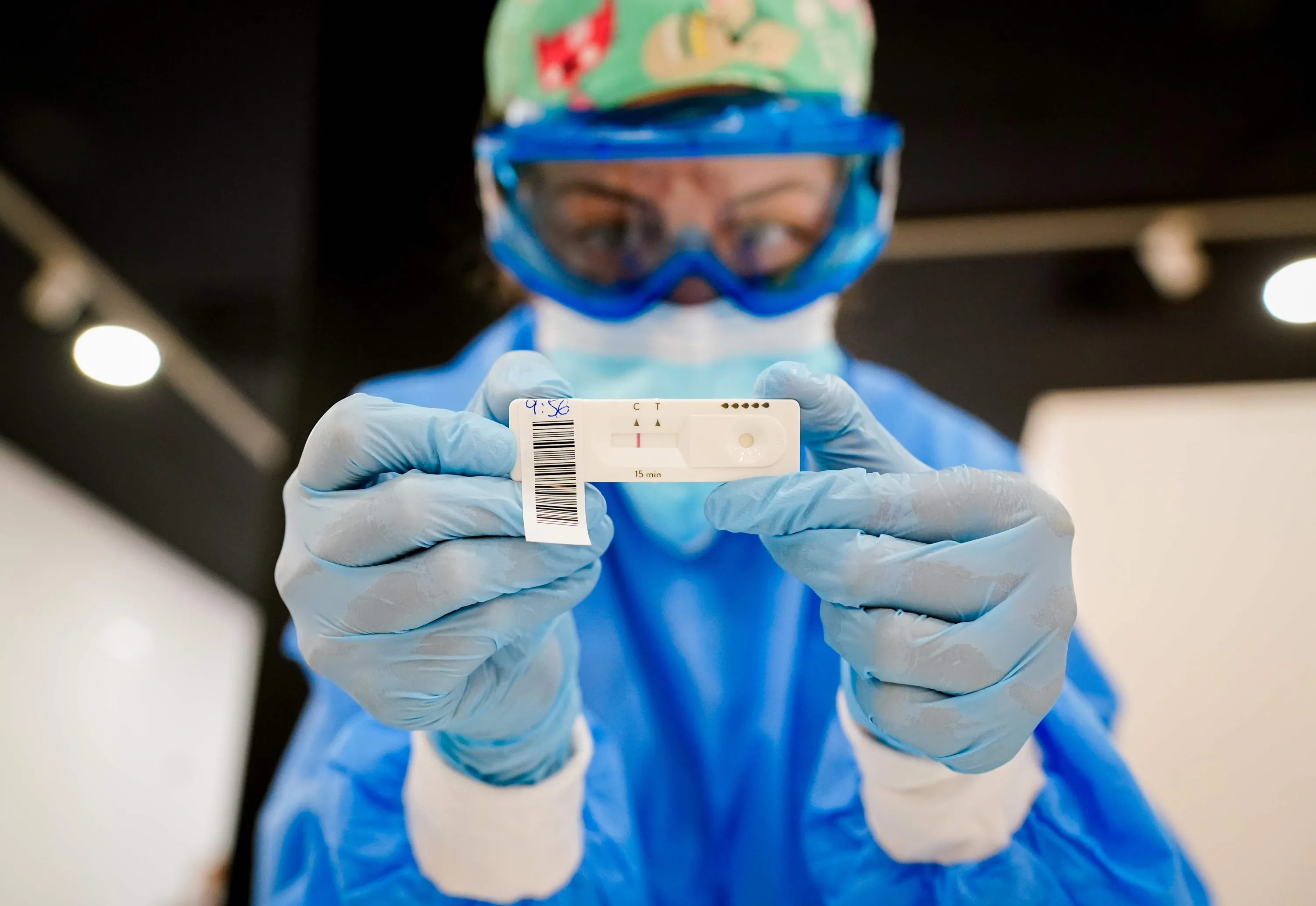 In this handout photo released on September 29, 2020 by the Comunidad de Madrid regional government, a healthcare worker holds a coronavirus quick diagnosis test that delivers results in 15-30 minutes at a test facility at the Puente de Vallecas neighborhood in Madrid. - Spain's government warned the Madrid authorities of drastic measures if the region failed to move decisively to slow the uncontrolled spread of coronavirus infections. The city and surrounding region is at the epicentre of a second wave of coronavirus that is sweeping Spain, having claimed more than 31,000 lives and infected over 700,000 in the highest infection rate in the European Union. (Photo by picturedesk.com/AFP Photo)