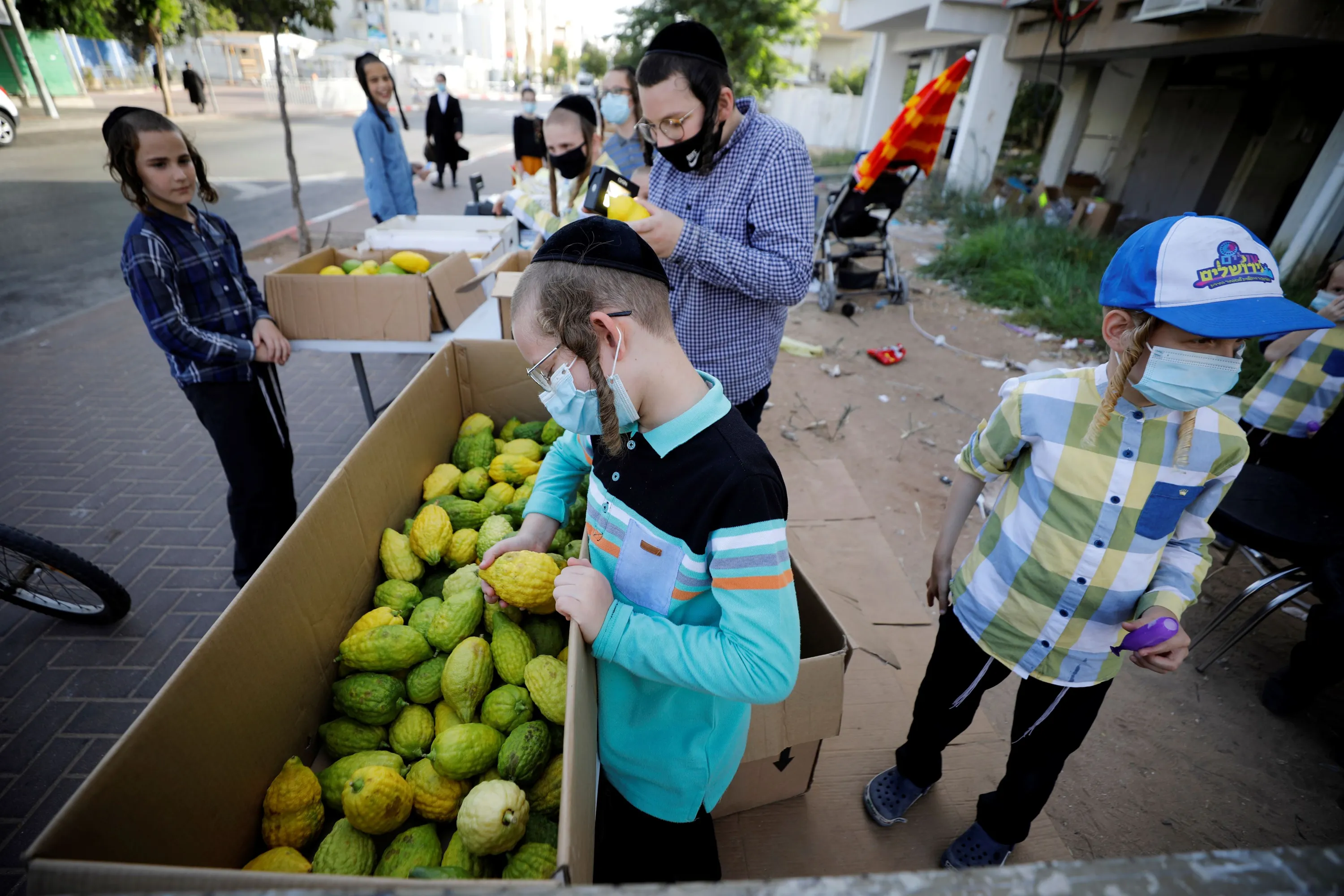 Ultra-Orthodox Jewish boys look at Etrog citrus fruits used in rituals during the upcoming Jewish holiday of Sukkot, amid Israel's second national lockdown to battle the coronavirus disease (COVID-19) crisis, in Ashdod, Israel on September 30, 2020. (Photo by Amir Cohen/Reuters)