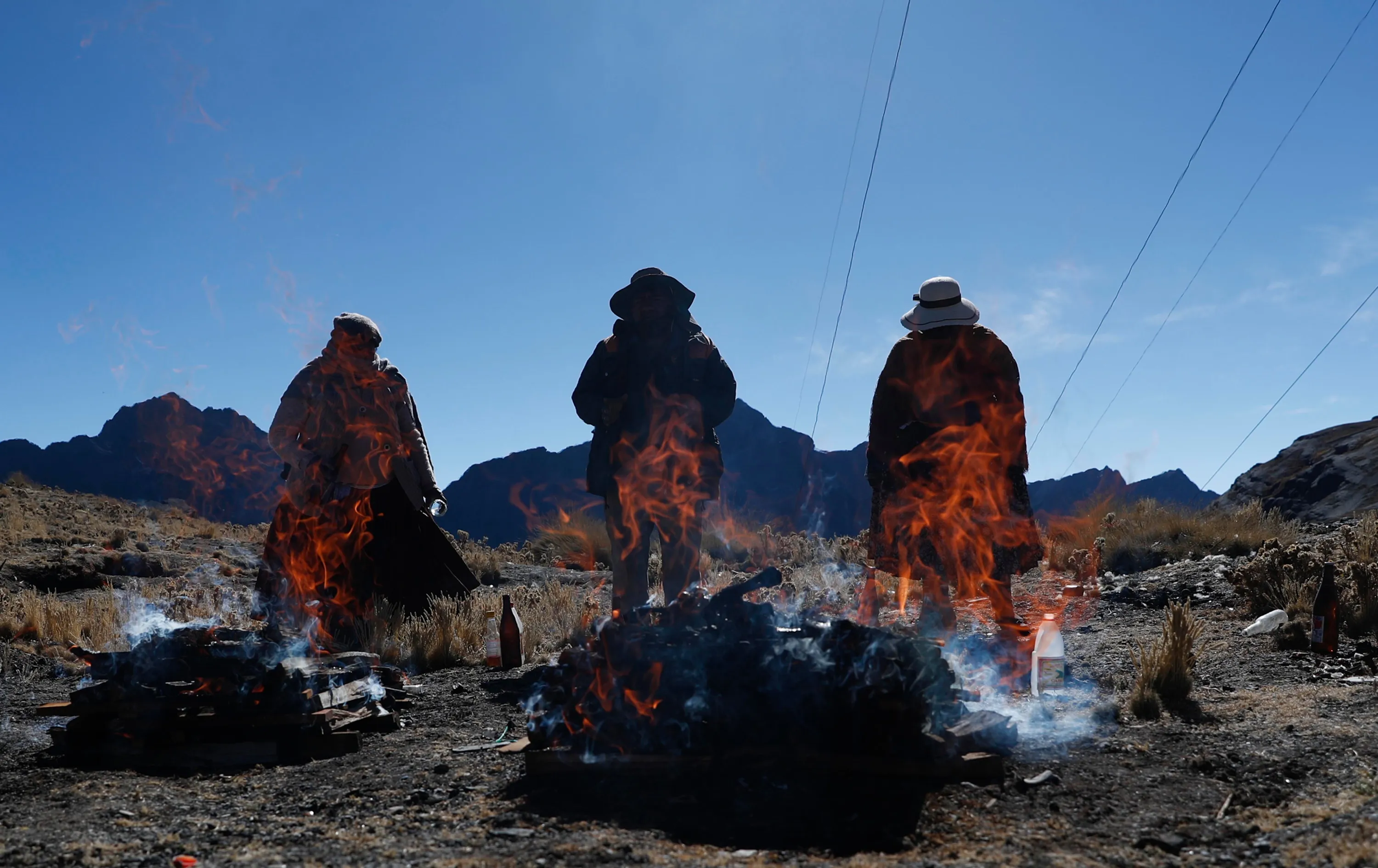People burn offerings in honor of “Pachamama” or Mother Earth, on La Cumbre, a mountain considered sacred on the outskirts of La Paz, Bolivia, Saturday, August 1, 2020. According to lore, the Pachamama awakens hungry and thirsty every August after the dry season, and to satiate her, devotees toss offerings including fruit, coca, sweets and dead llama fetuses into a bonfire. (Photo by Juan Karita/AP Photo)