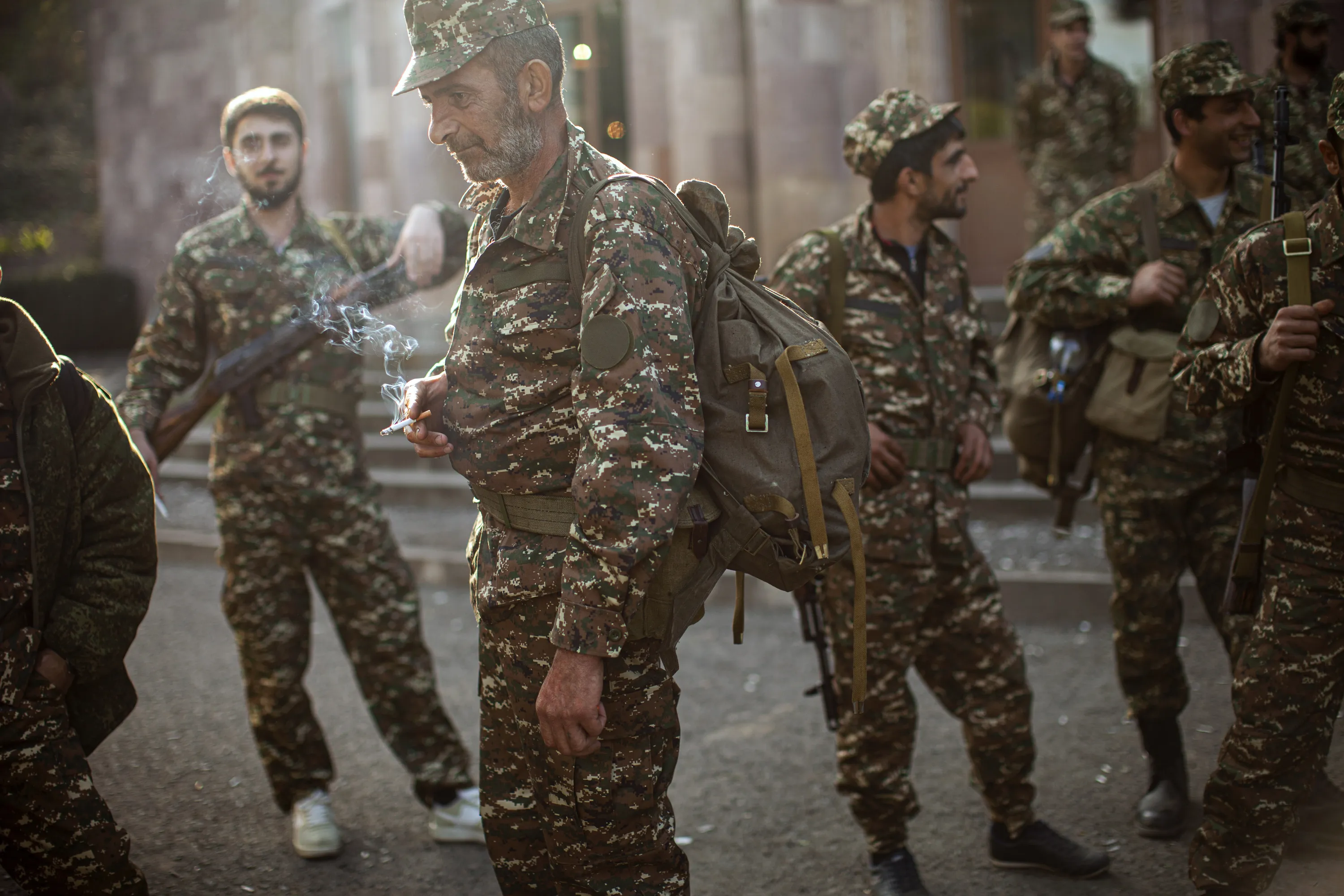 Ethnic Armenians volunteer recruits gather at a center where they receive their uniforms and weapons before being dispatched to the frontline near Hadrut, self-proclaimed Republic of Nagorno-Karabakh, Azerbaijan, Tuesday, September 29, 2020. Heavy fighting between Armenian and Azerbaijani forces over the separatist region of Nagorno-Karabakh continued for a fourth straight day on Wednesday, in the biggest escalation of a decades-old conflict in years that has killed dozens and left scores of others wounded. (Photo by Karen Mirzoyan/AP Photo)