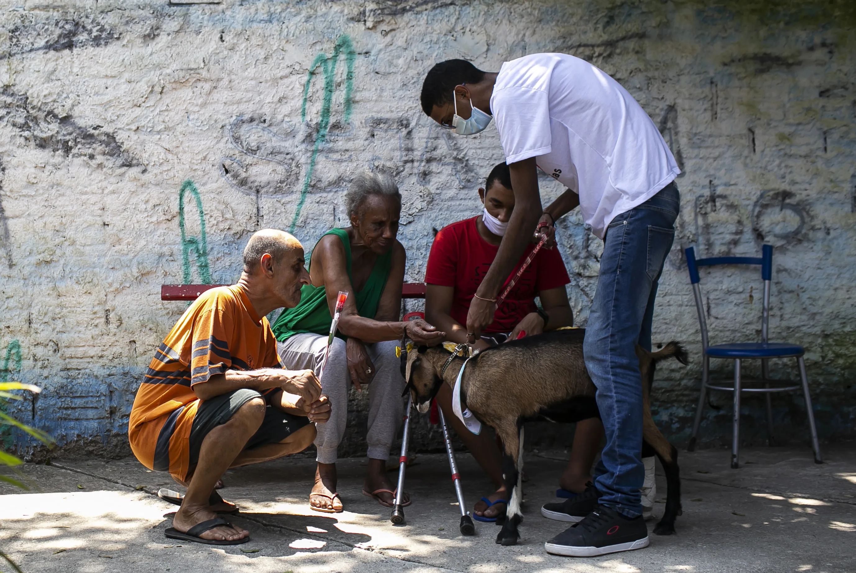 Seniors pet a goat named Jurema at the “Casa de Repouso Laços de Ouro” nursing home in Sepetiba, Brazil, Thursday, October 1, 2020. The Golias organization brought the animals, who they rescued from abandonment, to provide a little relief from the isolation many elderly people feel, cut off from friends and family due to fear of contagion from the new coronavirus. (Photo by Bruna Prado/AP Photo)
