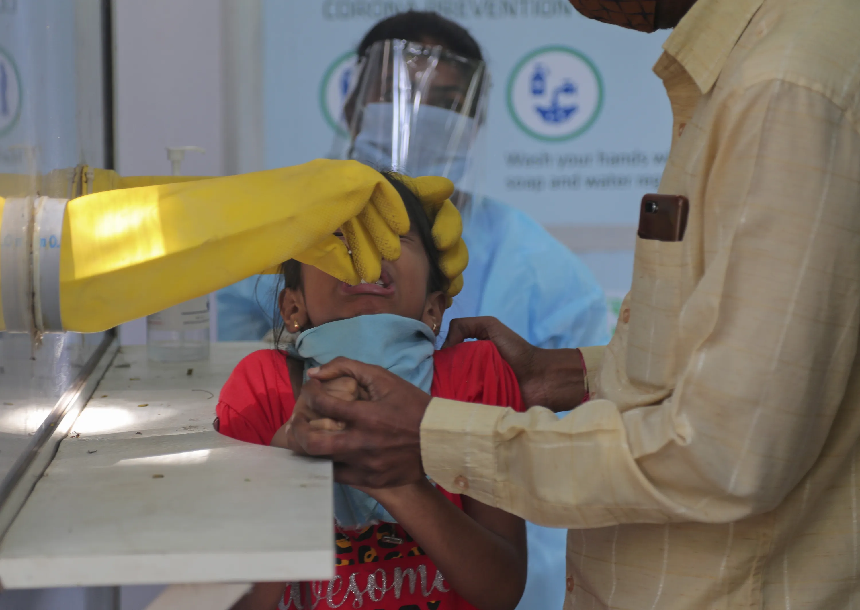 An adult helps hold a child as his nasal swab sample is taken by a health worker at a COVID-19 testing center in Hyderabad, India, Saturday, October 3, 2020. India has crossed 100,000 confirmed COVID-19 deaths on Saturday, putting the country's toll at nearly 10% of the global fatalities and behind only the United States and Brazil. (Photo by Mahesh Kumar A./AP Photo)