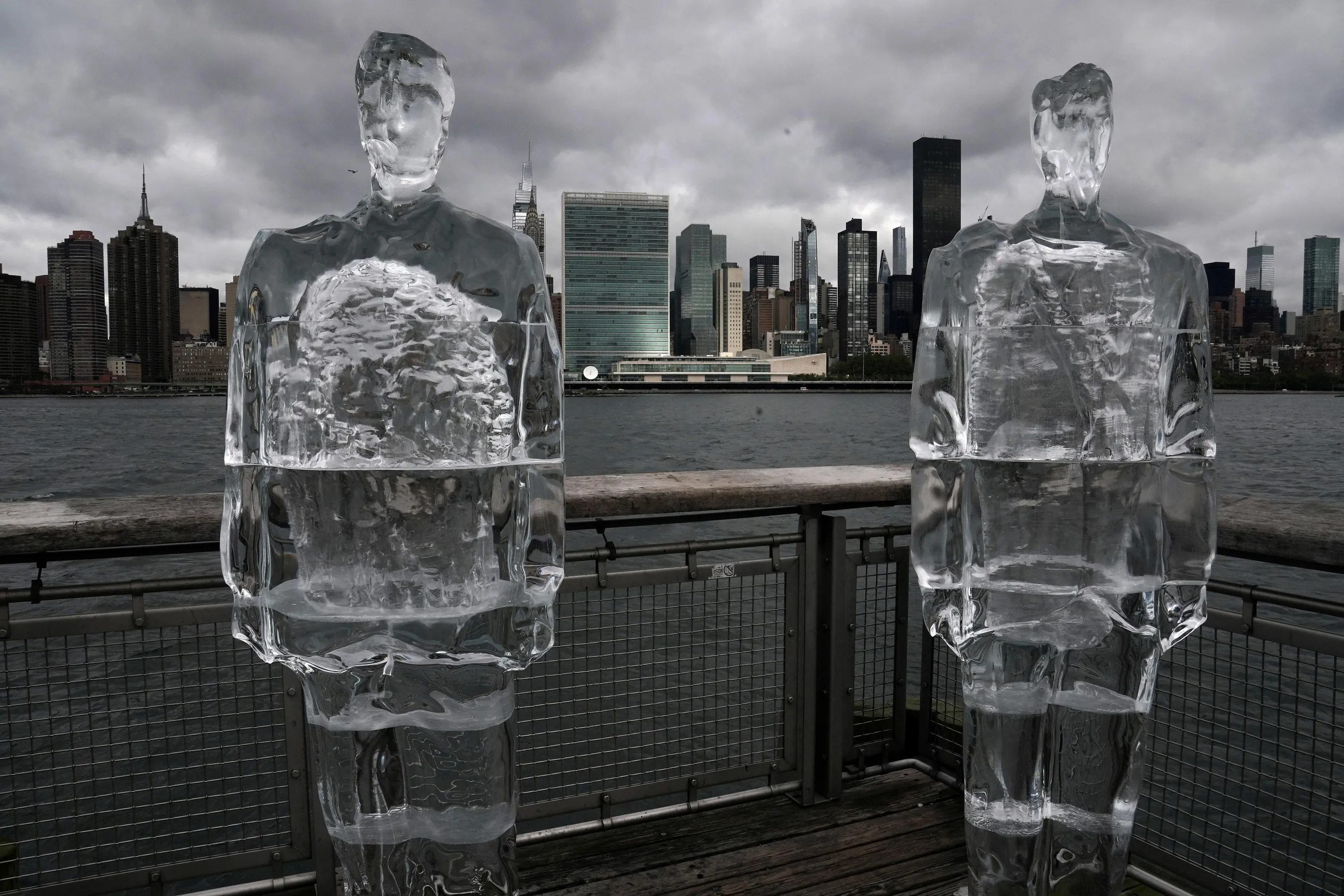 Two ice sculptures depicting U.S. President Donald Trump and Brazil's President Jair Bolsonaro sit across the Hudson River from the United Nations headquarters in the Queens Borough of New York City, New York, U.S., September 30, 2020. (Photo by Carlo Allegri/Reuters)