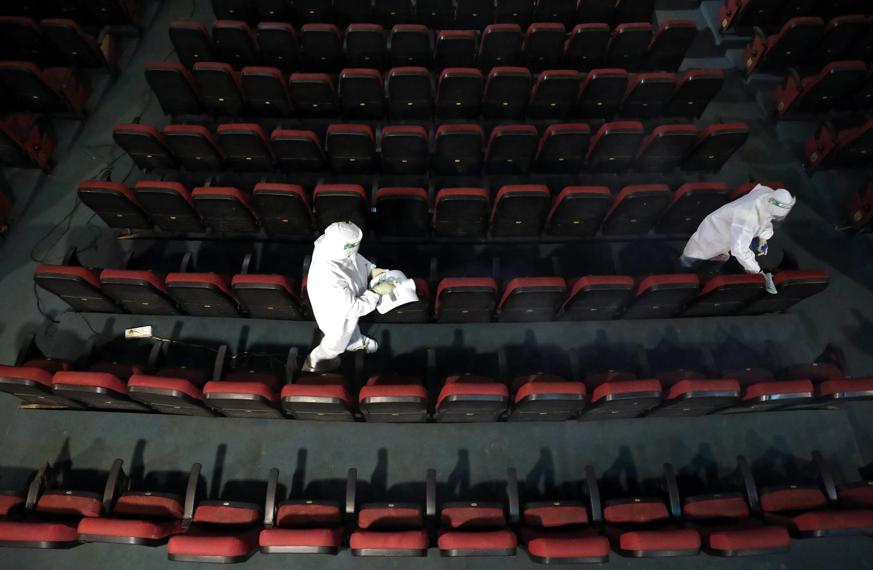 Workers wearing personal protective equipment (PPE) sanitize and clean the seats of Star theatre ahead of its reopening, amidst the outbreak of the coronavirus disease (COVID-19), in Kolkata, India, September 29, 2020. (Photo by Rupak De Chowdhuri/Reuters)