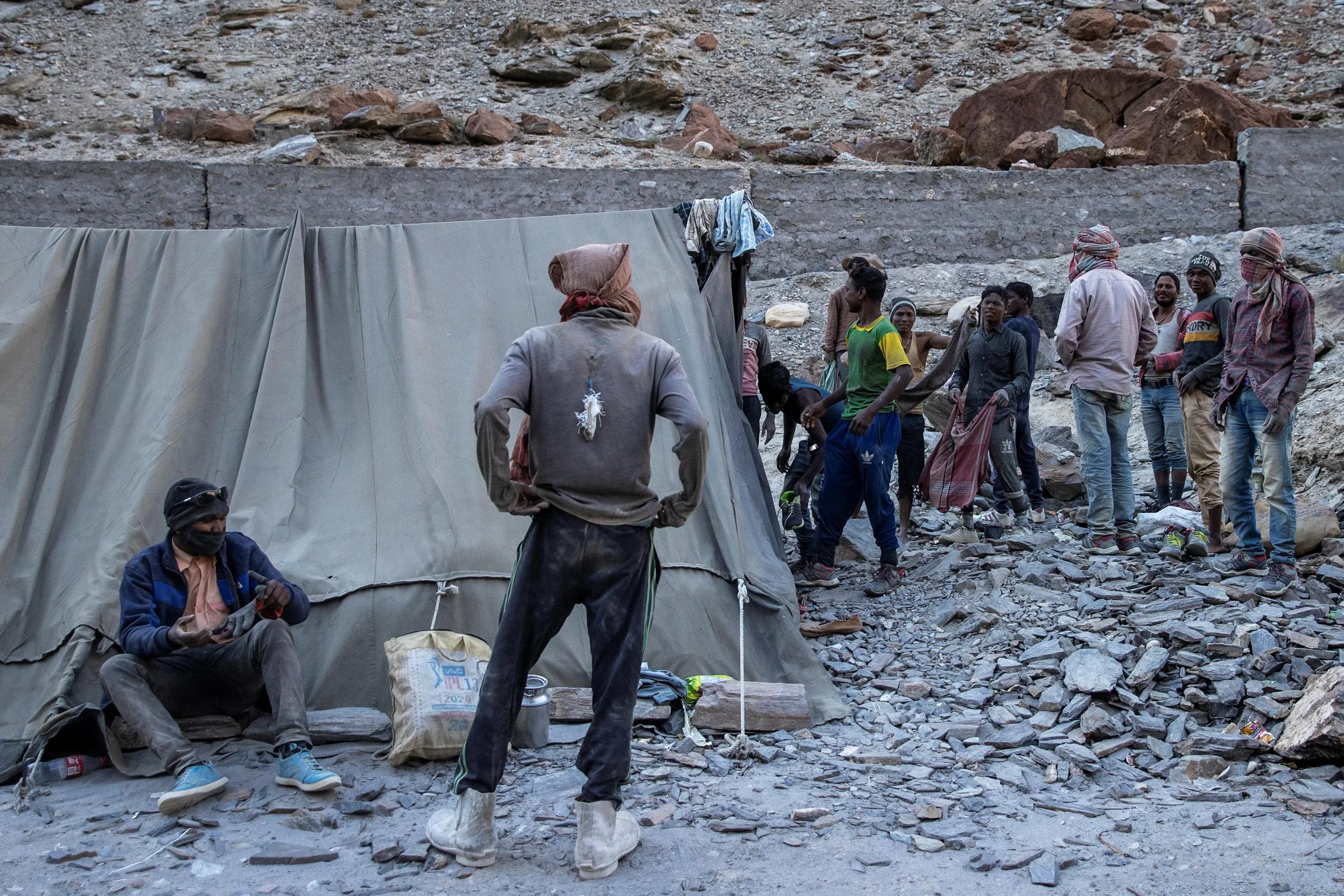 Workers from the Border Roads Organisation (BRO) clean themselves after arriving at their living quarters. They are working to construct a highway in the Ladakh region, India, September 17, 2020. Picture taken September 17, 2020. (Photo by Danish Siddiqui/Reuters)