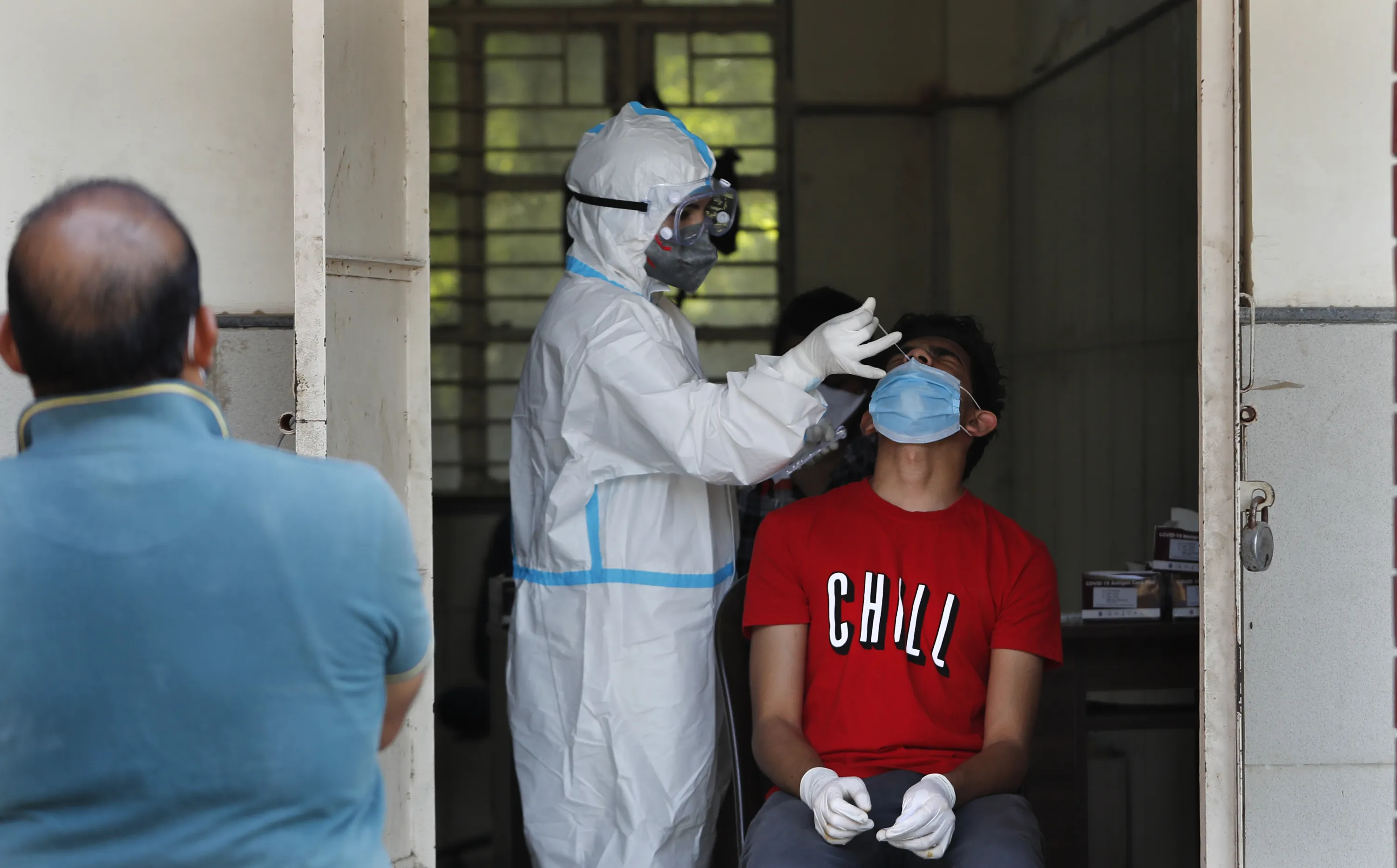 A health worker takes a nasal swab sample at a COVID-19 testing center in New Delhi, India, Saturday, October 3, 2020. (Photo by Manish Swarup/AP Photo)