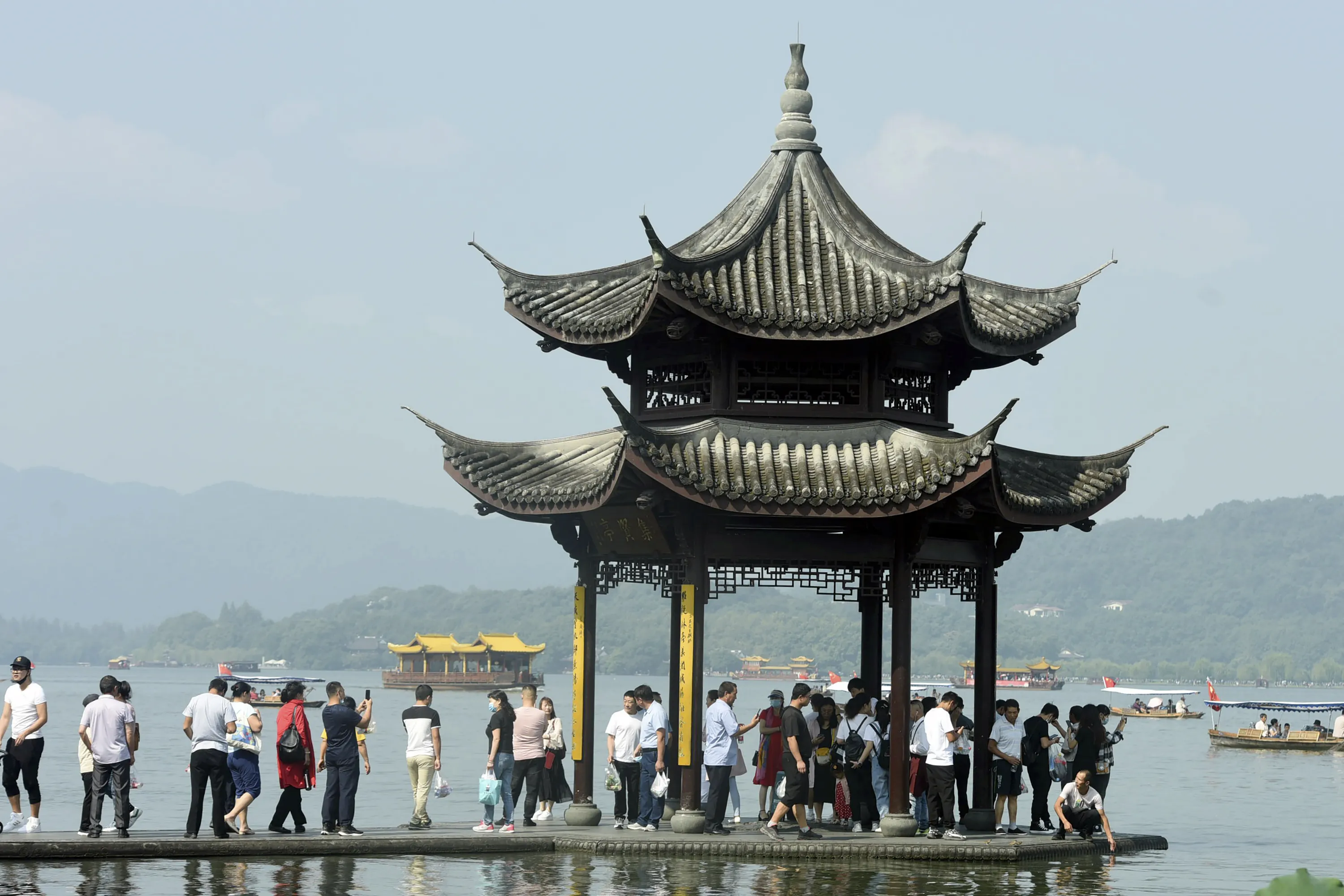 Tourists gather at a waterfront pavilion at the West Lake in Hangzhou in eastern China's Zhejiang Province, Thursday, October 1, 2020. Millions of Chinese tourists usually would use their week-long National Day holidays to travel abroad. This year, travel restrictions due to the coronavirus pandemic mean that some 600 million tourists – about 40% of the population – will travel within China during the holiday that began Thursday, according to Ctrip, China's largest online travel agency. (Photo by Chinatopix via AP Photo)