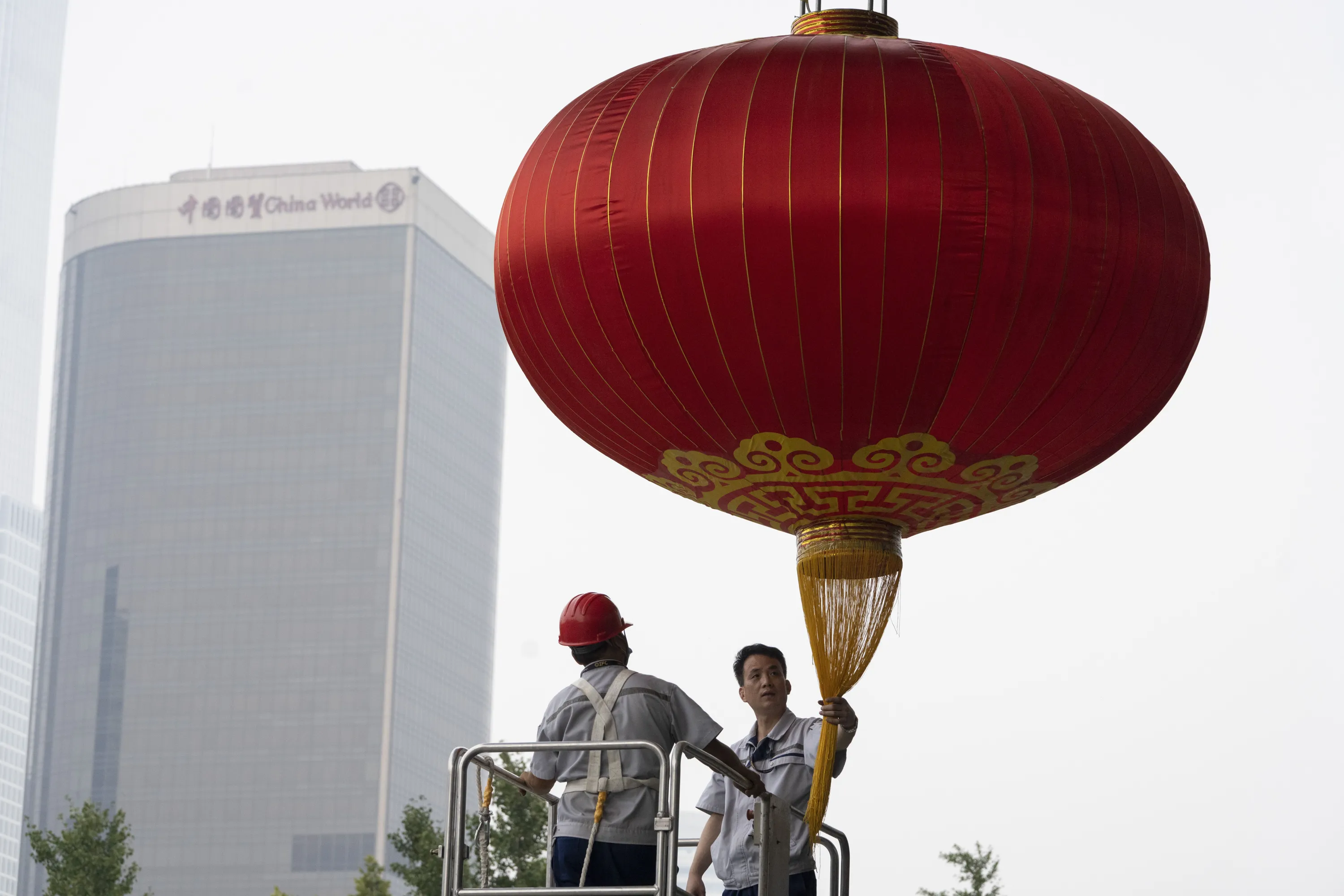 Workers prepare a giant lantern ahead of the Oct. 1 National Day holidays in Beijing on Monday, September 28, 2020. (Photo by Ng Han Guan/AP Photo)