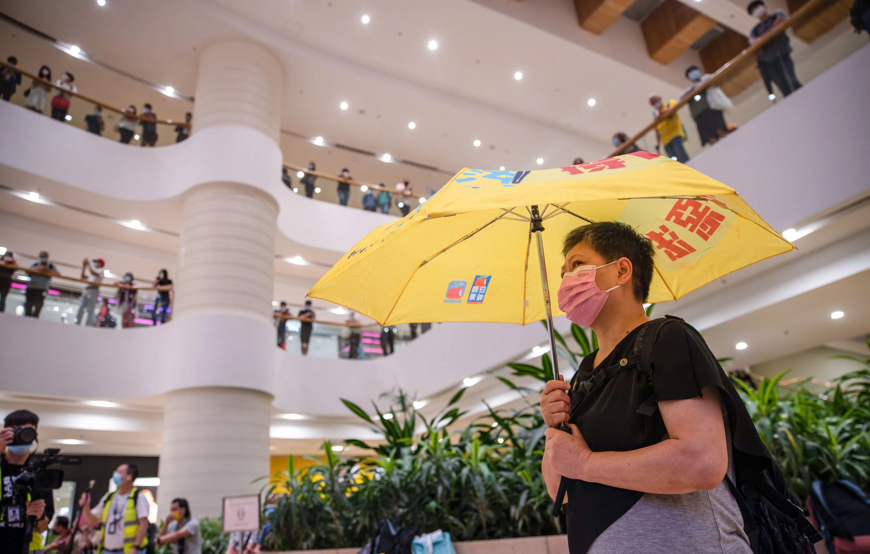 A protester wearing a facemask is seen holding a democracy umbrella during the protest to commemorate the 6th anniversary of Umbrella movement on September 28, 2020. Dozens of pro-democracy protesters gathered at the Pacific Place shopping mall in Hong Kong to mark the 6th anniversary of Umbrella movement where Hong Kongers took to the street and occupied the major roads in the city to demand for universal suffrage. (Photo by May James/SOPA Images/LightRocket via Getty Images)