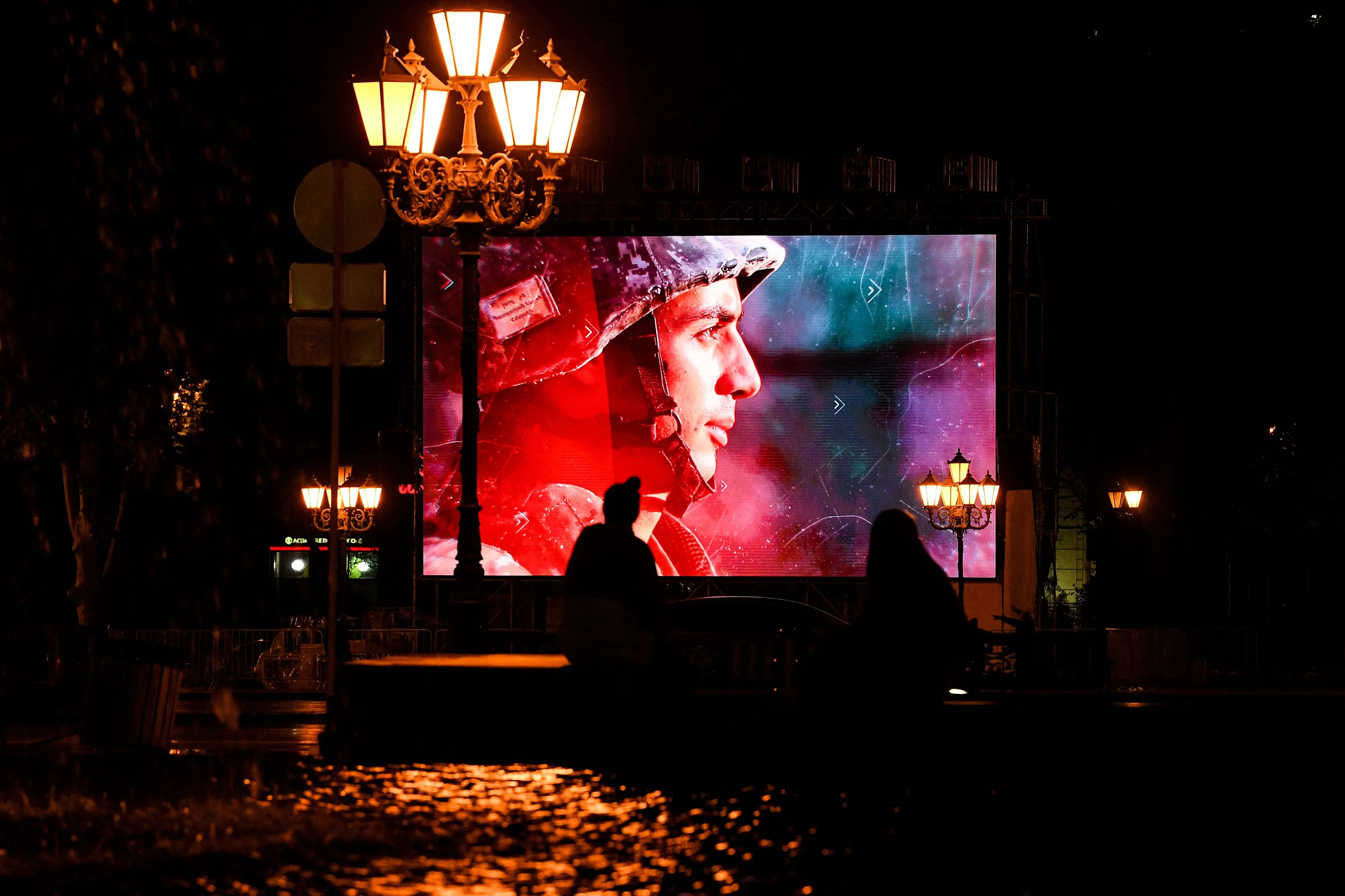 People walk in front of a big screen displaying military patriotic videos in Yerevan on October 5, 2020, during the ongoing fighting between Armenia and Azerbaijan over the breakaway Nagorno-Karabakh region. (Photo by AFP Photo/Stringer)