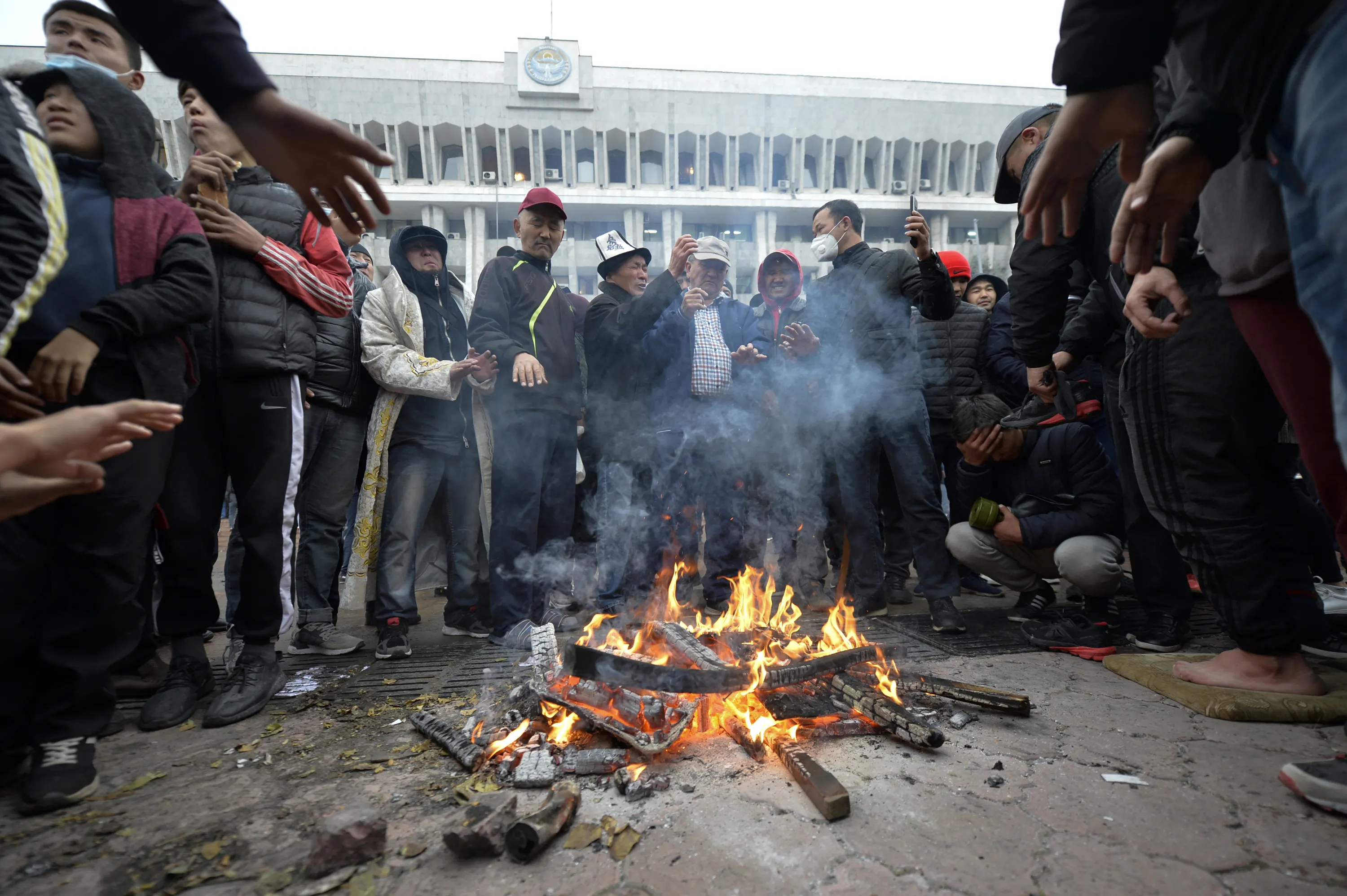 Protesters gather in front of the Kyrgyz government headquarters on the central square in Bishkek, Kyrgyzstan, Tuesday, October 6, 2020. Protesters have clashed with police in Kyrgyzstan's capital during a demonstration against the results of a parliamentary election. Early results in the election gave the majority of votes to two parties with ties to the ruling elites amid allegations of vote buying. (Photo by Vladimir Voronin/AP Photo)
