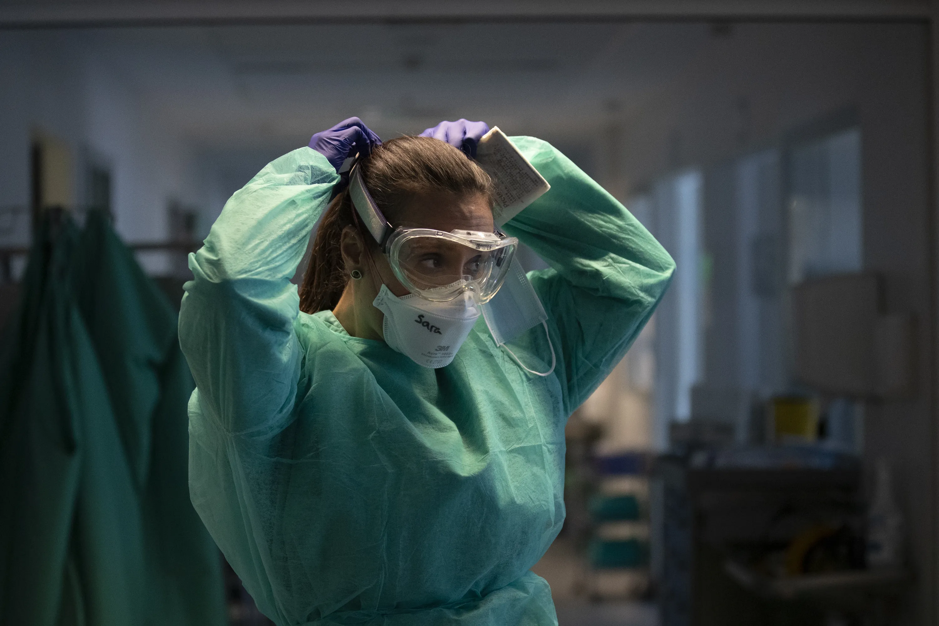 A healthcare worker puts on protective glasses at one of the intensive care units (ICU) at the University Hospital of Torrejon in Torrejon de Ardoz, Spain, Tuesday, October 6, 2020. Hospitals and their workers have been stretched to their limits again in Madrid, Europe's darkest spot in the second wave of the pandemic and where a second wave once again critical care beds have expanded to gymnasiums and surgery rooms. (Photo by Manu Fernandez/AP Photo)