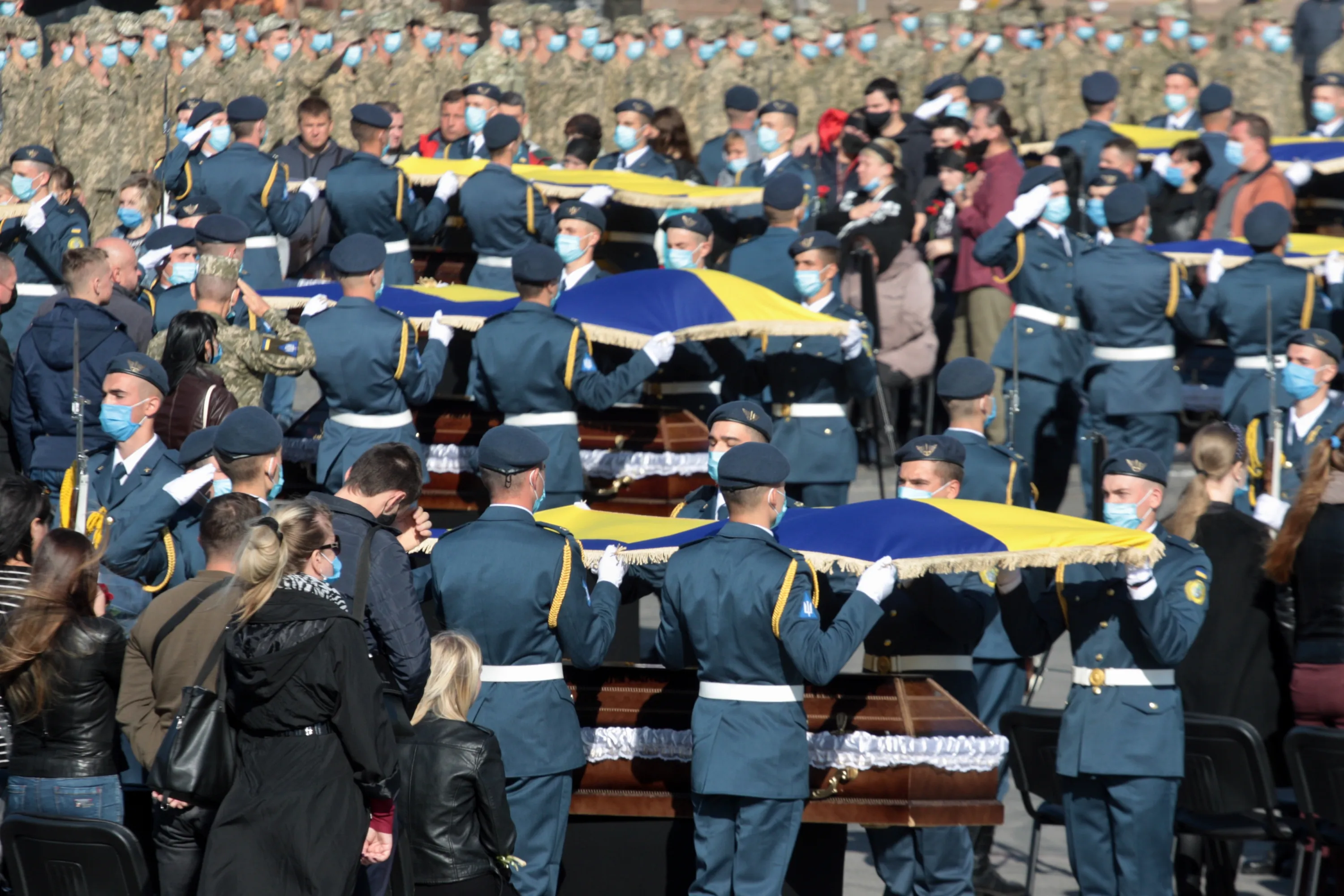 Servicemen cover the coffins of cadets of the Kharkiv National Air Force University who died in an Antonov An-26 transport plane crash with Ukrainian flags during a farewell ceremony at the central square in Kharkiv on October 6, 2020. (Photo by Sergey Bobok/AFP Photo)