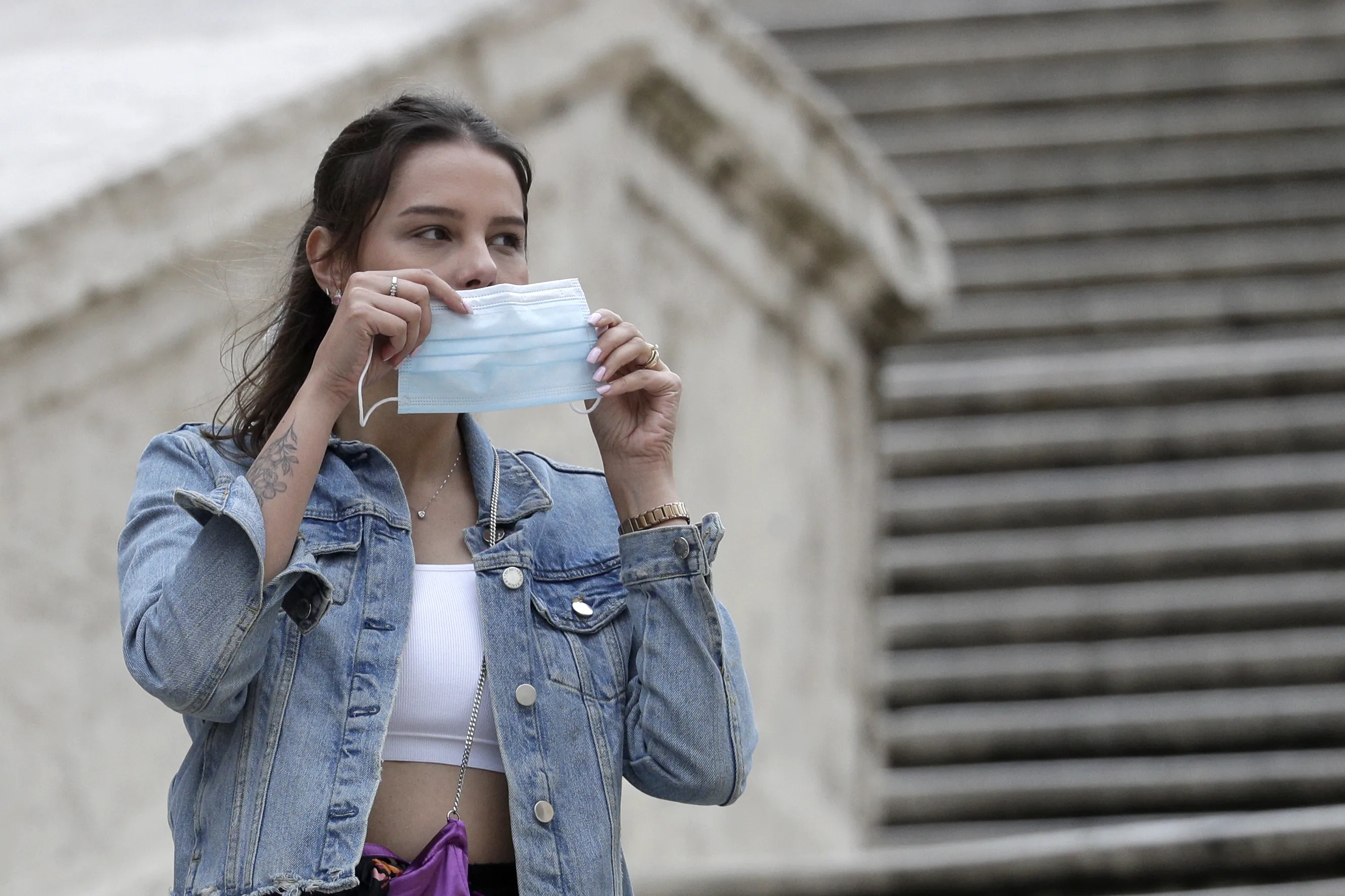 A woman is about to wear a face mask to stop the spread of COVID-19, in Rome, Tuesday, October 6, 2020. Italy's health minister said that the government is examining a proposal to make masks mandatory outdoors as the country enters a difficult phase of living alongside COVID-19 with the number of infections growing steadily for the last nine weeks. (Photo by Gregorio Borgia/AP Photo)