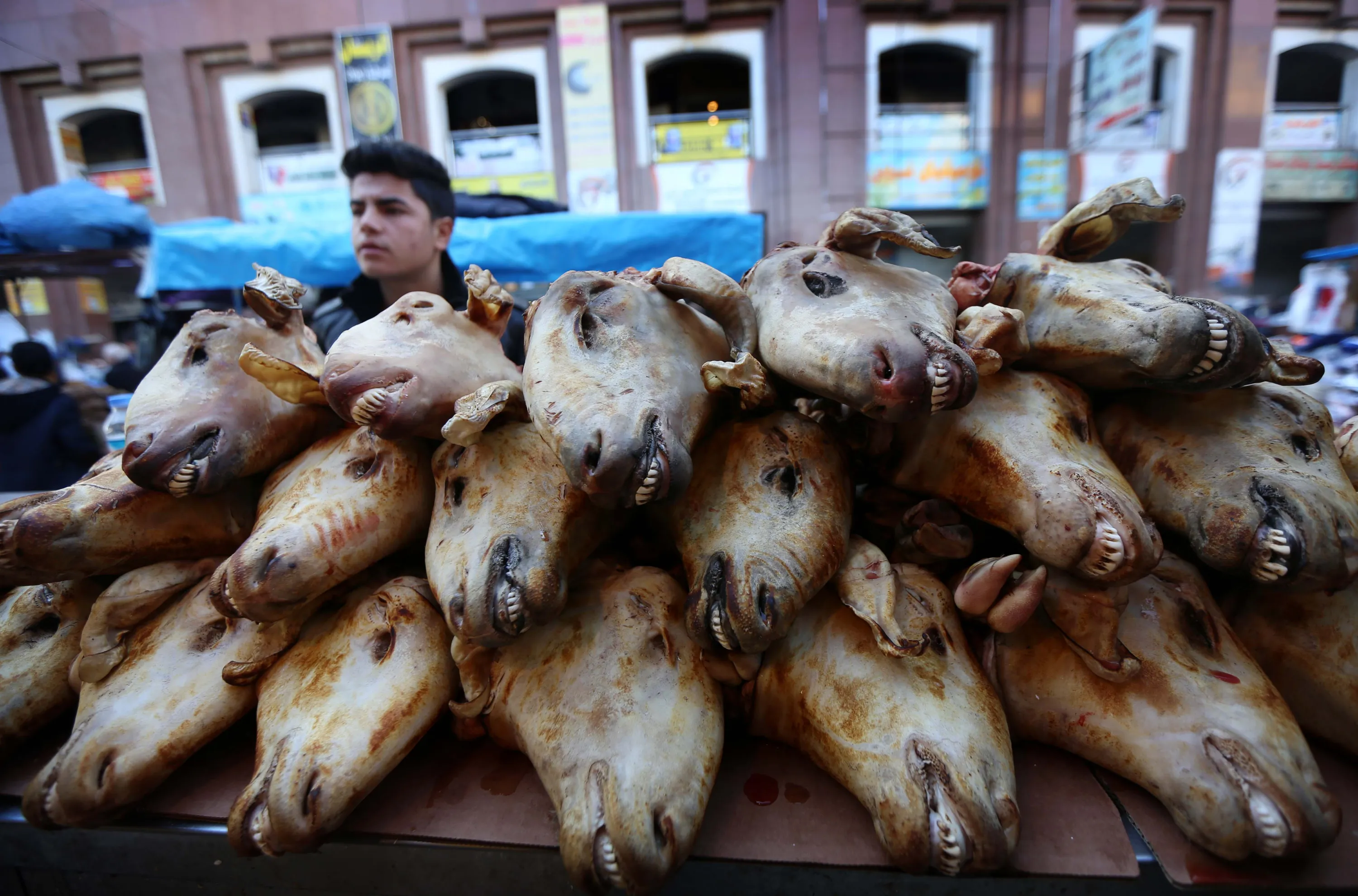 An Iraqi Kurdish street vendor sells cooked goat heads in a market in Arbil, the capital of the autonomous Kurdish region of northern Iraq, on February 16, 2016. (Photo by Safin Hamed/AFP Photo)