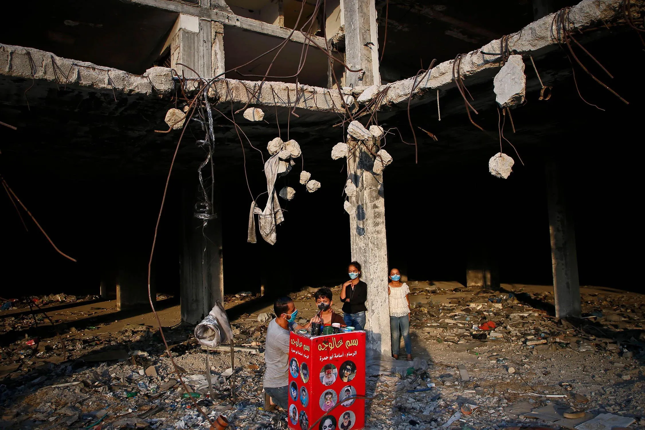 Palestinian artist Osama abu Hamra draws face masks on children to create awareness about ways to prevent the spread of the Covid-19 coronavirus, at the ruins of a building in Gaza City on September 8, 2020. (Photo by Mohammed Abed/AFP Photo)