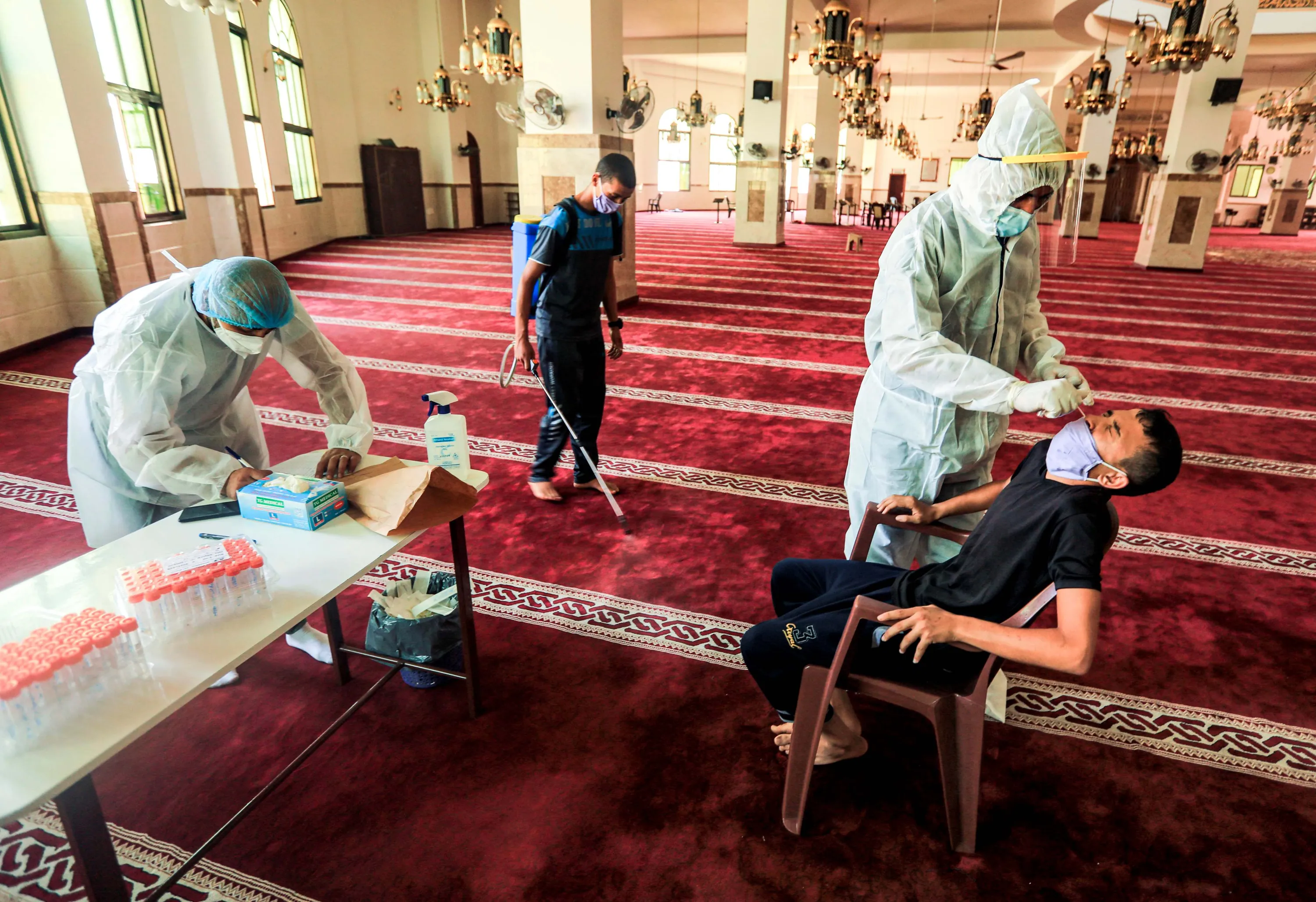 A Palestinian medical worker takes a swab sample from a man at a mosque in Gaza City on September 20, 2020, while testing for potential COVID-19 coronavirus disease cases. (Photo by Mahmud Hams/AFP Photo)