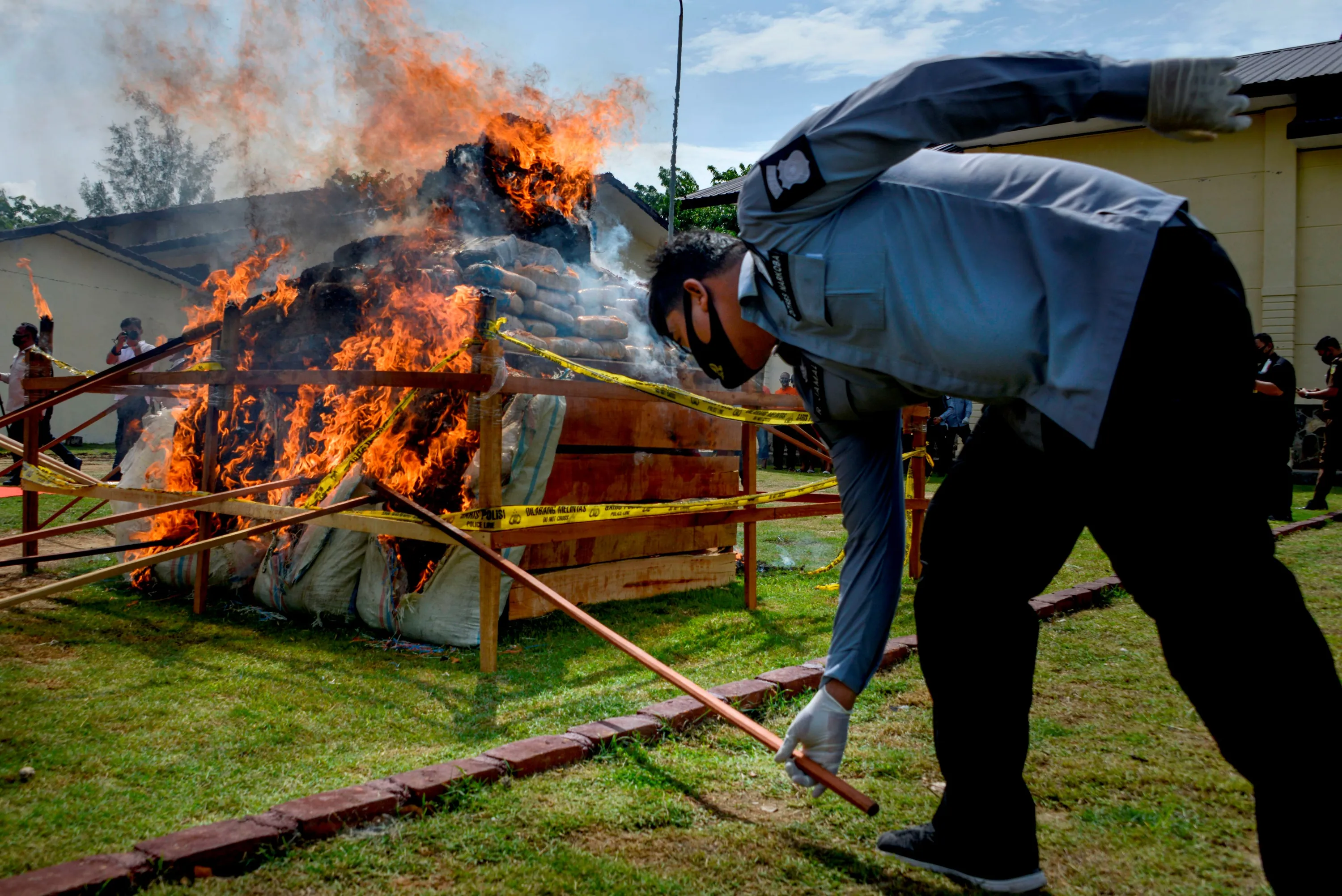 Indonesian narcotic policemen burn a pile of confiscated marijuana during a ceremony at the regional police headquarters in Banda Aceh on September 23, 2020. Some 372.6 kilograms of marijuana, 80.2 kilograms of methamphetamines, and 27,400 ecstacy pills that were previously seized by police were destroyed during the event. (Photo by Chaideer Mahyuddin/AFP Photo)