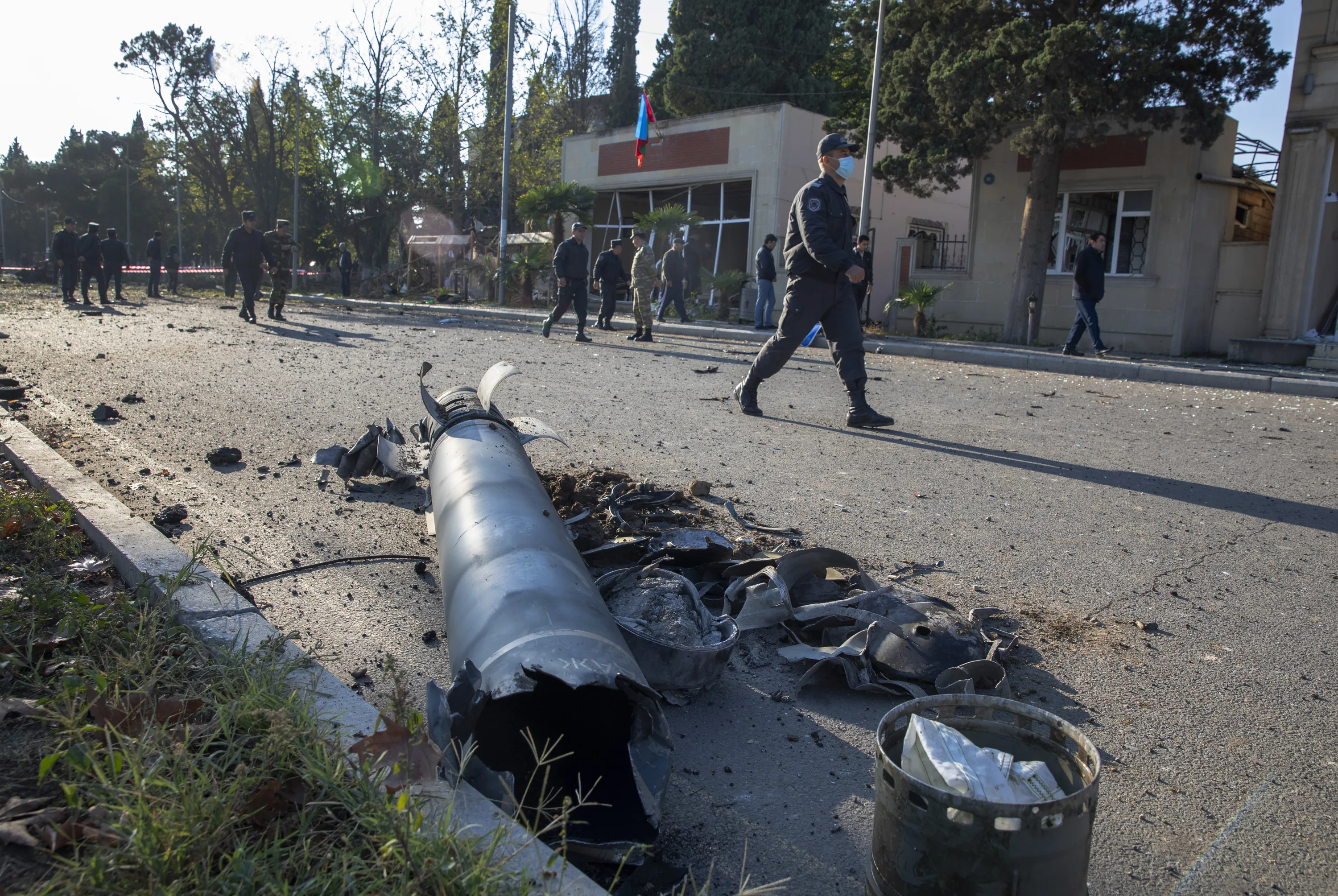 Members of Azerbaijan's security forces, walk past remains of a missile, as they inspect the damage following an overnight missile attack by Armenian forces, in the city of Ganja, Azerbaijan's second-largest city, Thursday, October 8, 2020. The fighting between Armenian and Azerbaijani forces over the separatist territory of Nagorno-Karabakh, continued with both sides accusing each other of launching attacks. The region lies in Azerbaijan but has been under the control of ethnic Armenian forces backed by Armenia since the end of a separatist war in 1994. (Photo by Unal Cam/DHA via AP Photo)
