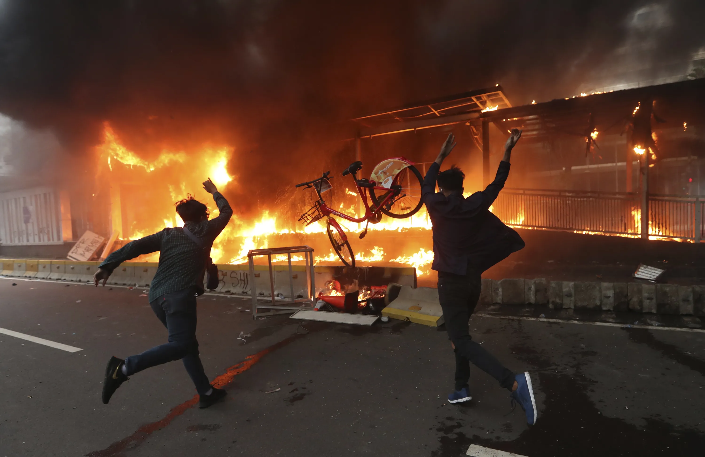 Protesters add a bicycle to a burning metro station during a rally in Jakarta, Indonesia, Thursday, October 8, 2020. (Photo by Achmad Ibrahim/AP Photo)