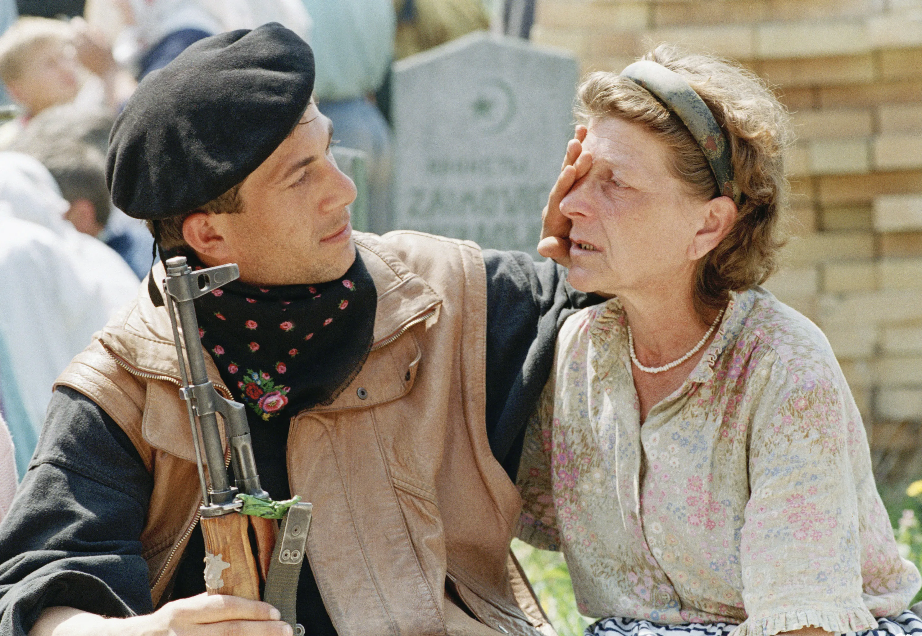 In this Wednesday afternoon, April 28, 1993 file photo, a Bosnian soldier, ready to go to the frontline, wipes away the tears of his mother in front of a Muslim gravestone in Rhahic, a Bosnian town 43 miles north of Tuzla. (Photo by Karsten Thielker/AP Photo/File)