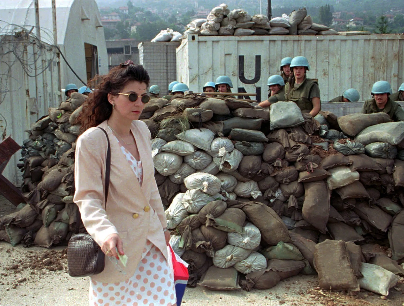 In this Saturday July 29, 1995 file photo, a Sarajevan woman walks past French United Nations soldiers preparing new barricades at a U.N. compound in Sarajevo, on a relatively peaceful day in the beseiged Bosnian capital. (Photo by Karsten Thielker/AP Photo/File)