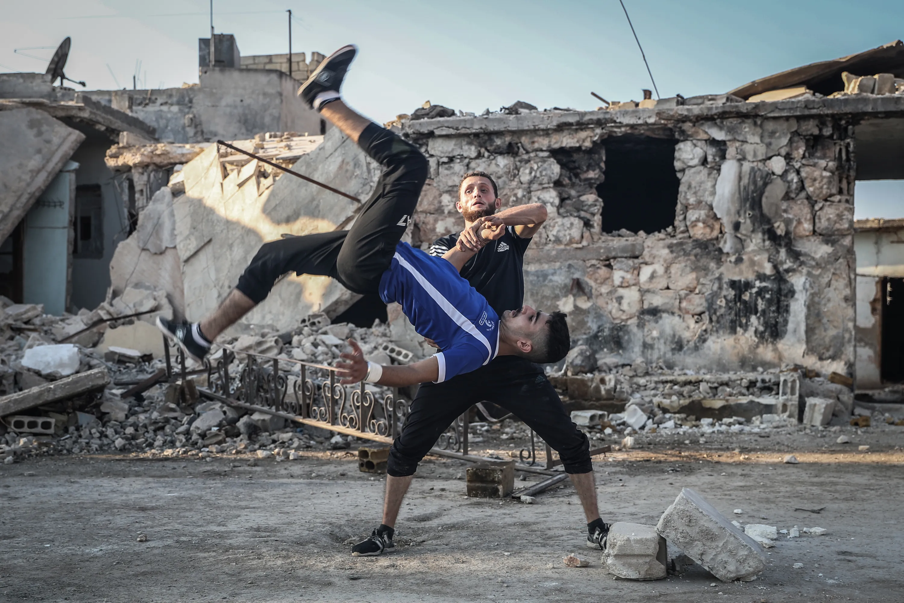 Members of a team comprising Syrian athletes perform parkour stunts amongst the rubble of destroyed buildings in the town of Kafr Nouran, Syria on September 25, 2020. (Photo by Anas Alkharboutli/picture alliance via Getty Images)