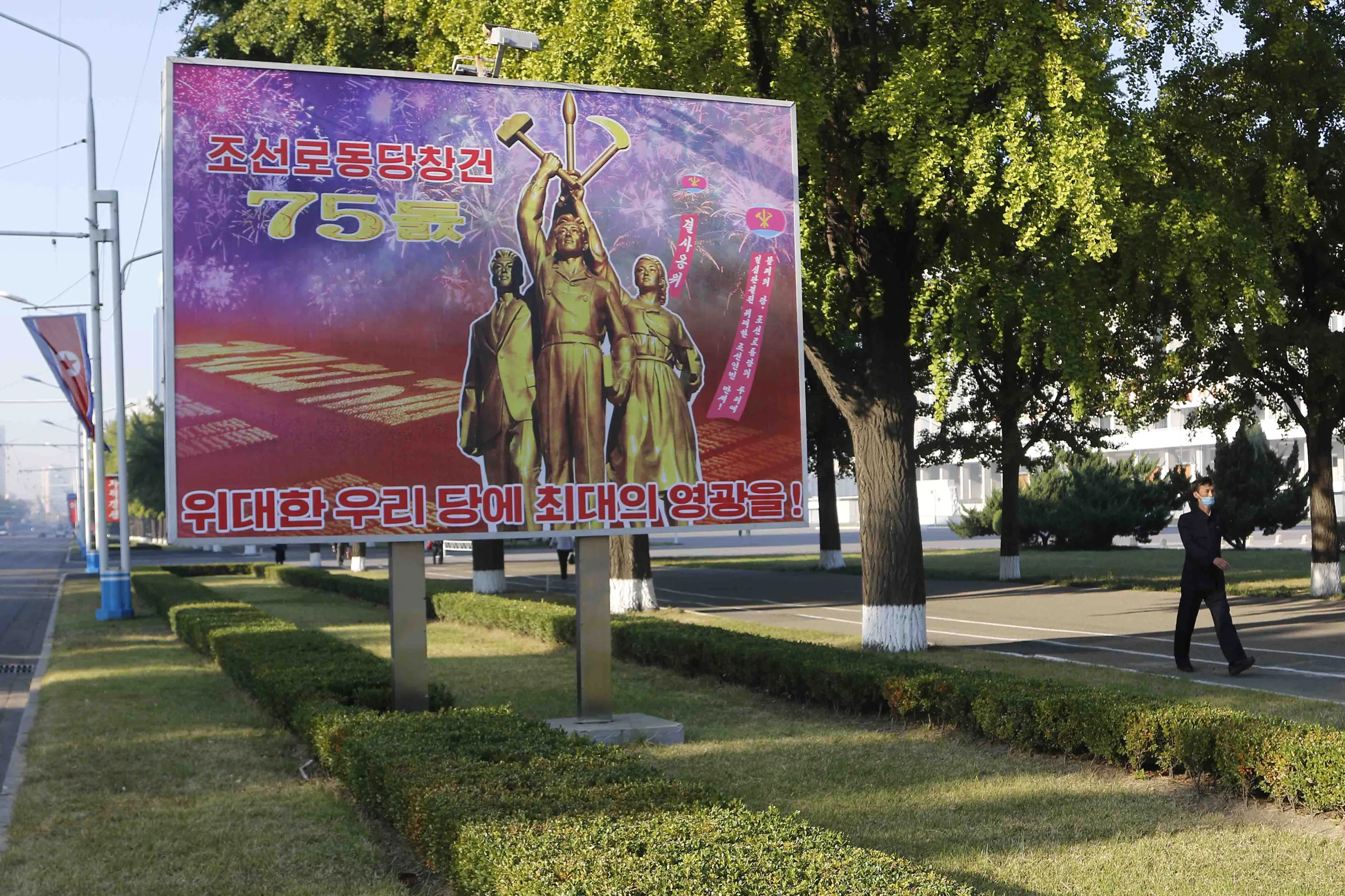 A man walks on a street in Pyongyang, Saturday, October 10, 2020, on the occasion of the 75th founding anniversary of the Workers' Party of Korea (WPK). The words on a poster reads: “75th founding anniversary of the WPK, Best glory to our great party”. North Korea is celebrating the 75th anniversary of its ruling party with outside observers expecting leader Kim Jong Un to take center stage in a massive military parade in capital Pyongyang. (Photo by Jon Chol Jin/AP Photo)