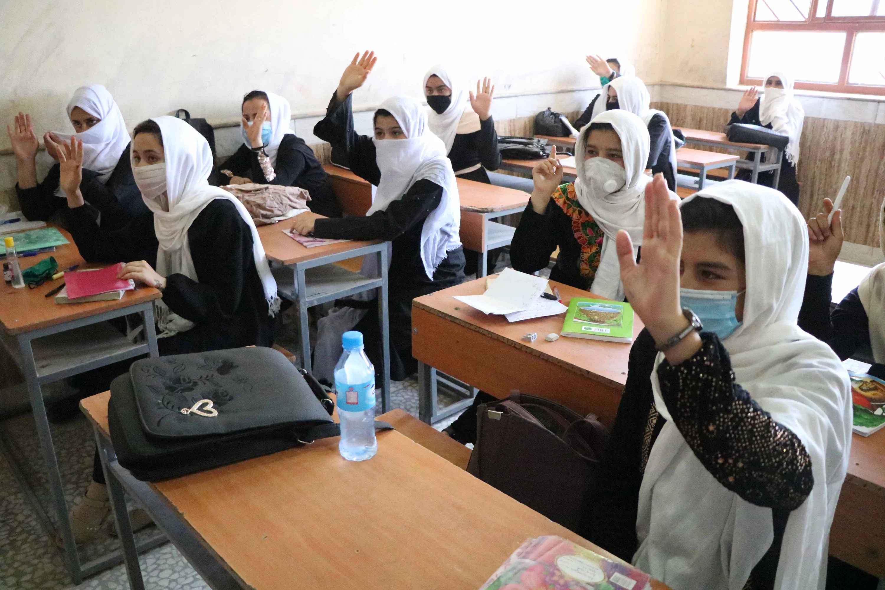 Afghan student girls attend the second day of their school after the educational institutes opened in Herat, Afghanistan, 23 August 2020. Schools reopen across Afghanistan, in a trial following months of closure due to the pandemic. (Photo by Jalil Rezayee/EPA/EFE)