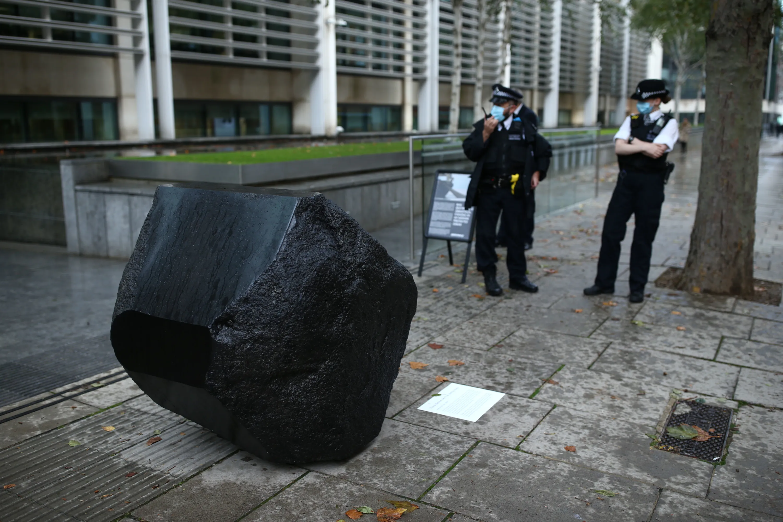 “Klang Full Stop”, one of three art installations by Fiona Banner aka the Vanity Press, outside the Home Office in Westminster, London on October 5, 2020, as part of Greenpeace's campaign to protect marine protected areas from illegal and destructive fishing. (Photo by Yui Mok/PA Images via Getty Images)