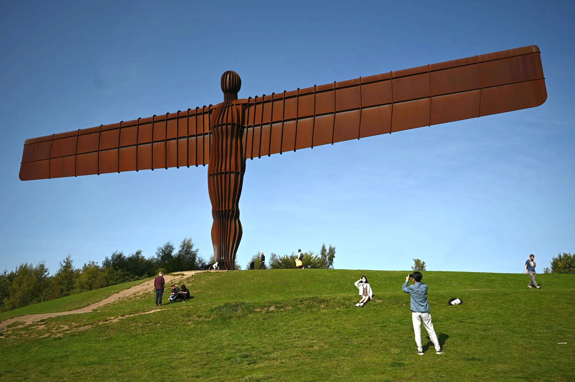 Visitors are seen at the iconic sculpture designed by Antony Gormley “Angel of the North” in Gateshead, northeast England, on September 17, 2020. The British government on Thursday announced new restrictions for northeast England, the latest region to see a surge in coronavirus cases as Prime Minister Boris Johnson warned of a “second hump” in nationwide transmission. Residents in the northeast, which includes the cities of Newcastle and Sunderland, will no longer be allowed to socialise outside their own homes or support bubble from Friday onwards. (Photo by Oli Scarff/AFP Photo)