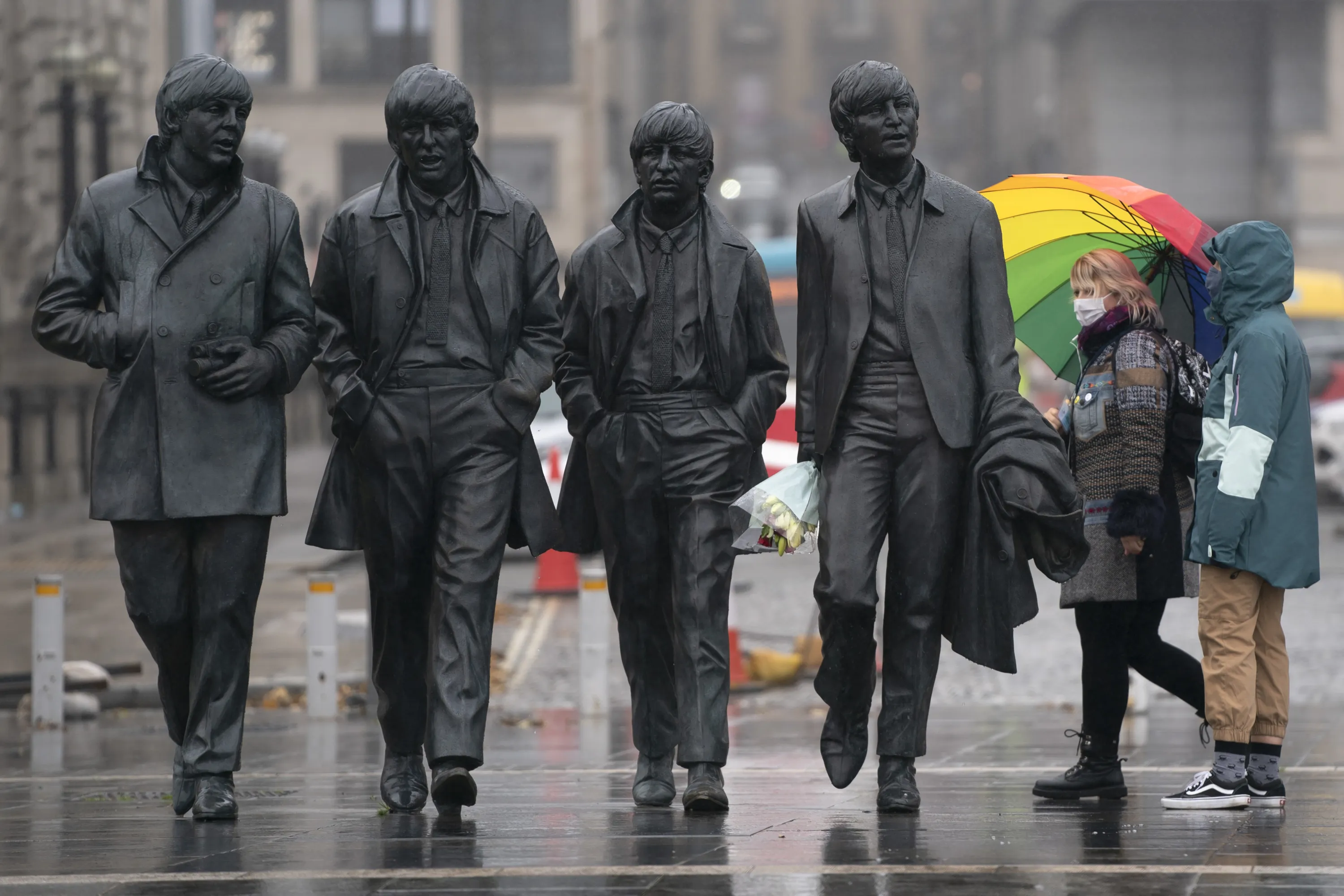 Members of the public wearing face masks stand near a statue of The Beatles in Liverpool, England, Monday October 12, 2020, as Prime Minister Boris Johnson prepares to lay out a new three-tier alert system for England. The Liverpool City Region is expected to face the tightest restrictions under the new system, which will classify regions as being on “medium”, “high” or “very high” alert. (Photo by Jon Super/AP Photo)
