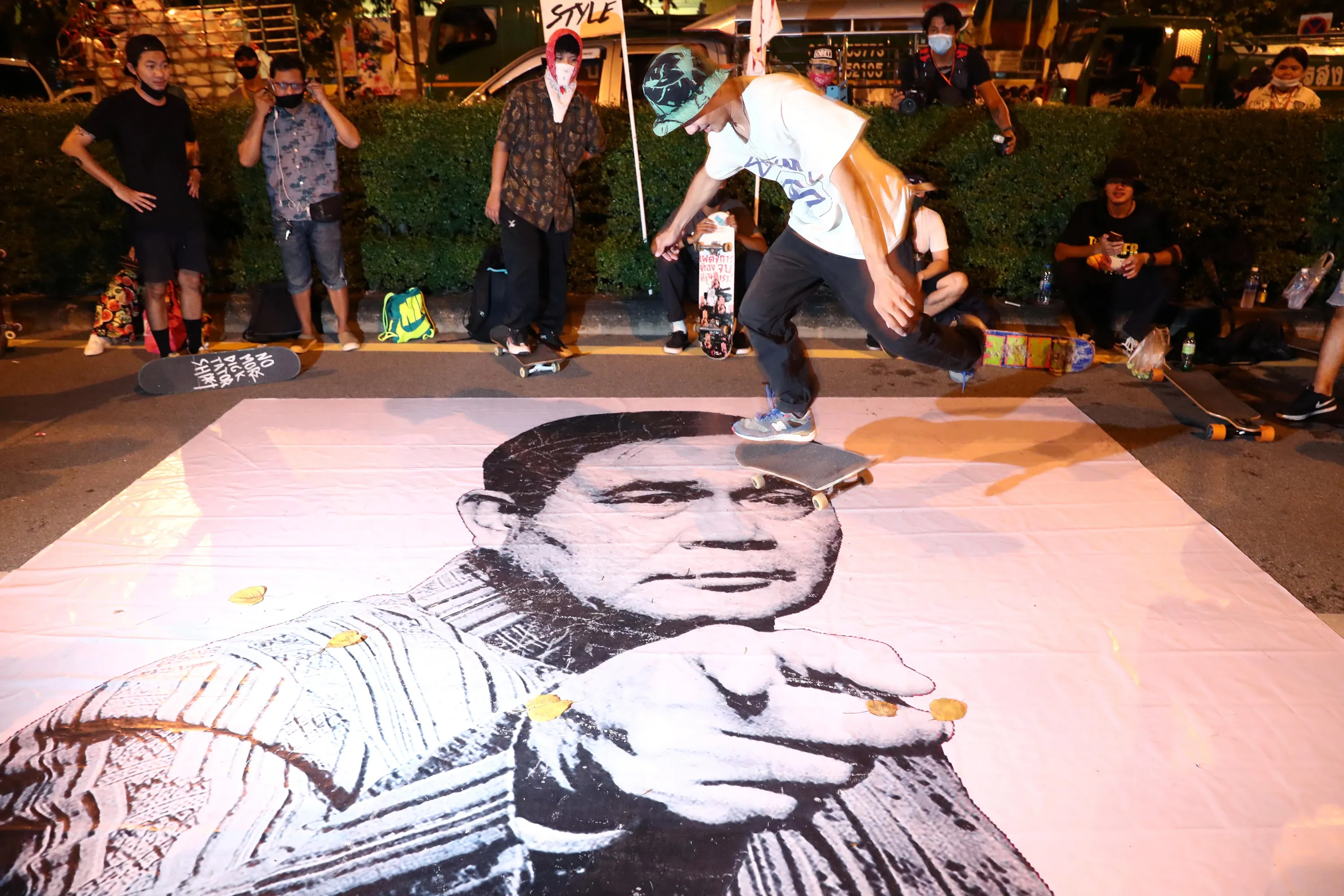 An anti-government demonstrator skates over an image of Thailand's Prime Minister Prayuth Chan-ocha during a Thai anti-government mass protest, on the 47th anniversary of the 1973 student uprising, in Bangkok, Thailand on October 14, 2020. (Photo by Athit Perawongmetha/Reuters)