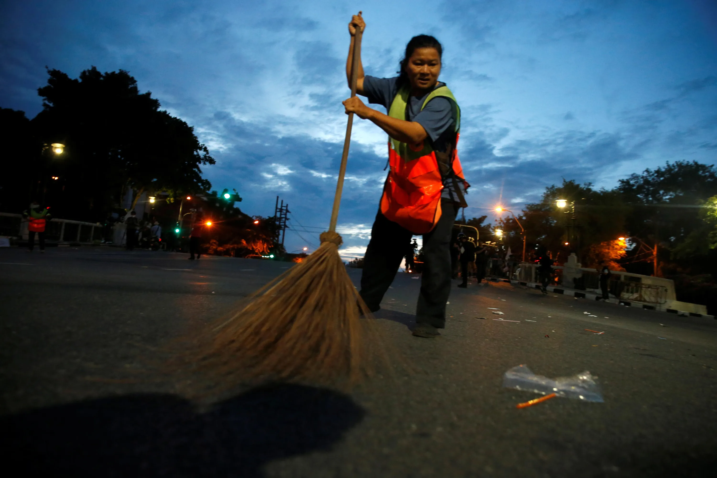 A cleaner sweeps up trash on a street after an anti-government protest on the 47th anniversary of the 1973 student uprising, in Bangkok, Thailand on October 15, 2020. (Photo by Soe Zeya Tun/Reuters)