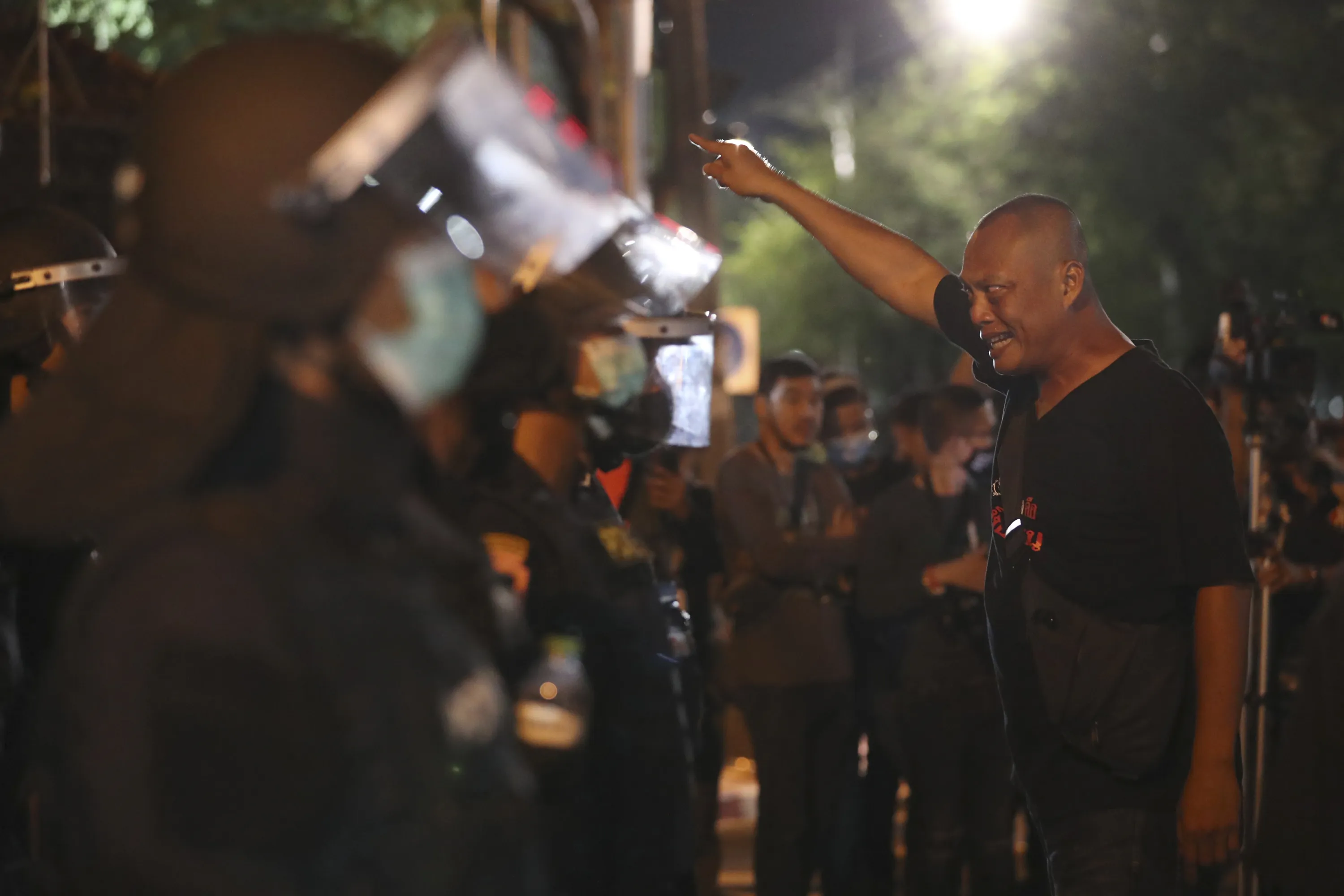 A pro-democracy protester shouts at Thai policemen during a demonstration in Bangkok, Thailand, Thursday, October 15, 2020. Thai police dispersed a group of protesters holding an overnight rally outside the prime minister's office. (Photo by Rapeephat Sitichailapa/AP Photo)